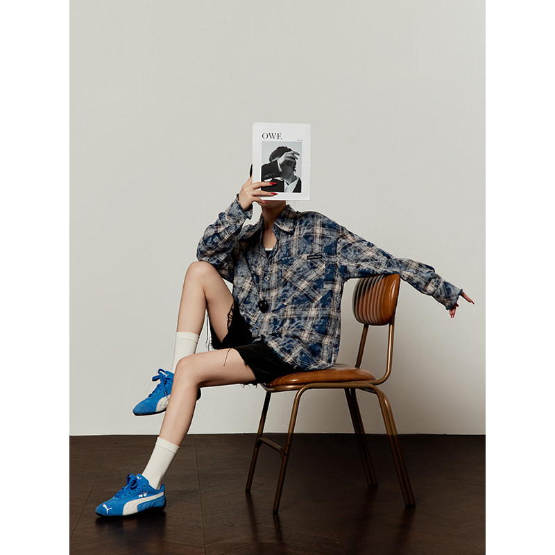 磨毛高街衬衫 周里物 外套 2026春夏新款 女款 美式 复古蓝色格子衬衫