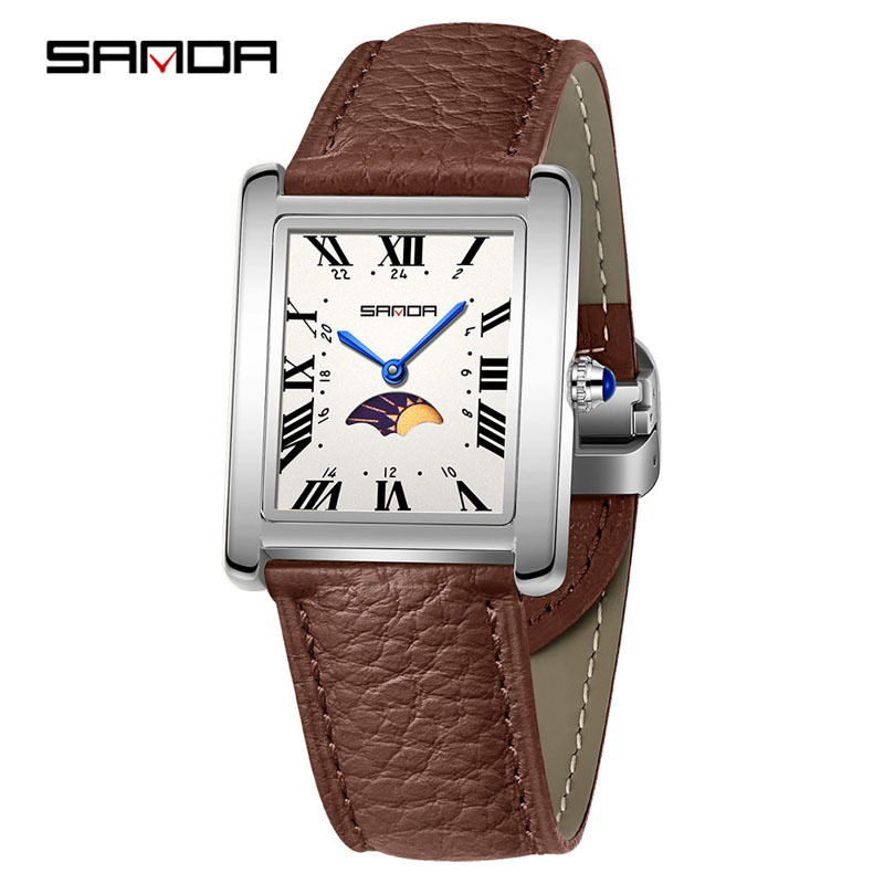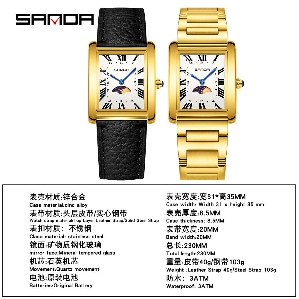 SANDA男士 方形实心钢带皮带月相腕表防水商务通勤男女表 女士经典