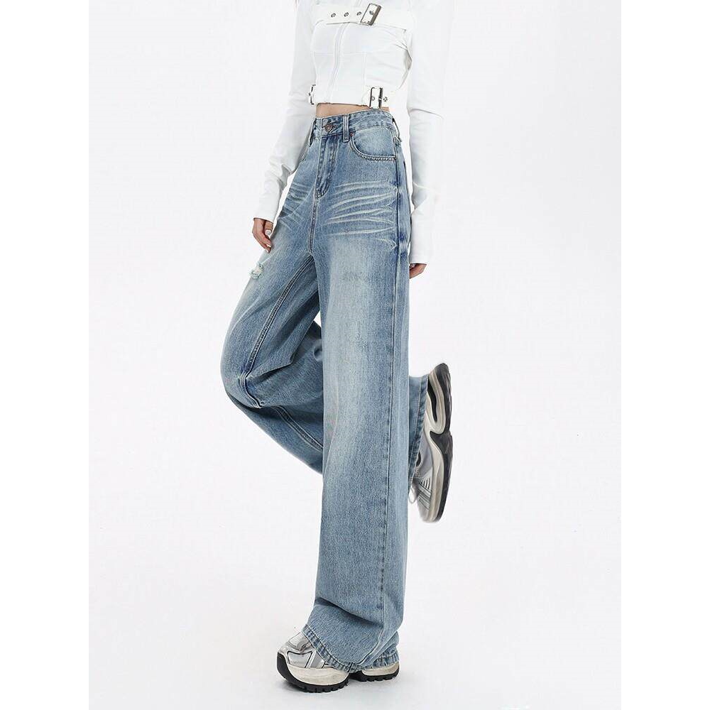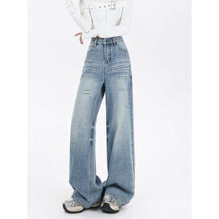 女宽松直筒设计垂感拖地裤 EGG SLY美式 浅蓝阔腿牛仔裤 子春秋季由