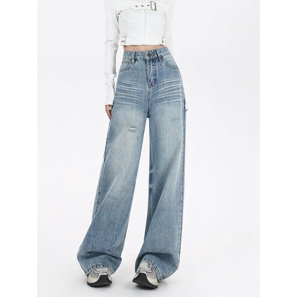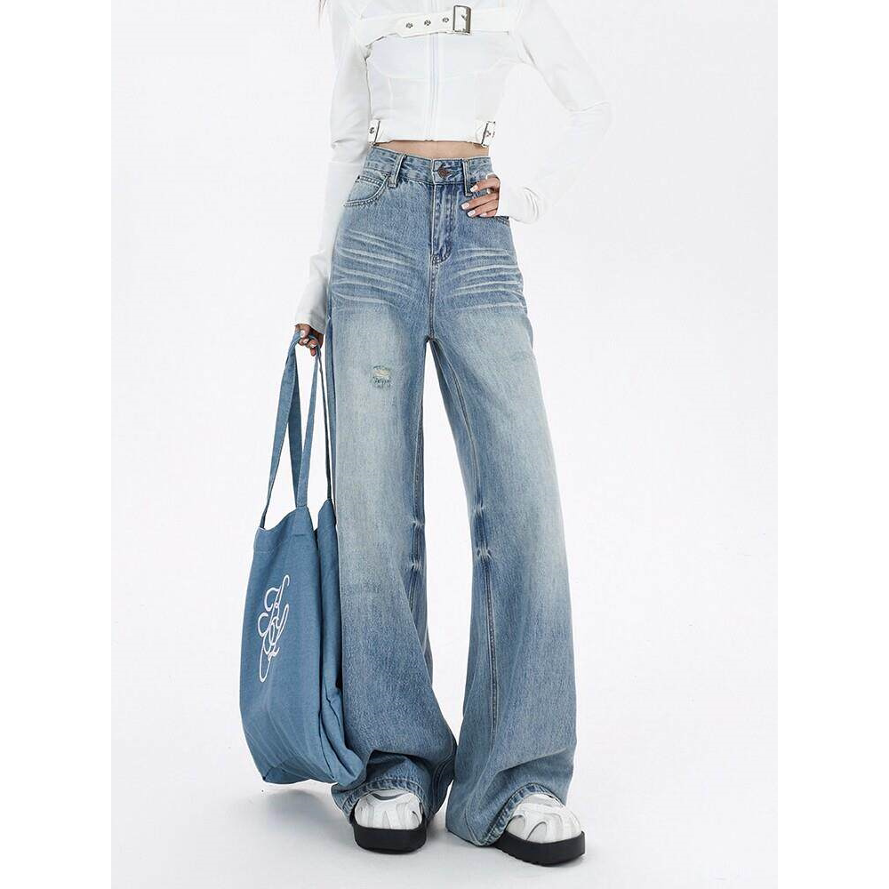 女宽松直筒设计垂感拖地裤 EGG SLY美式 浅蓝阔腿牛仔裤 子春秋季