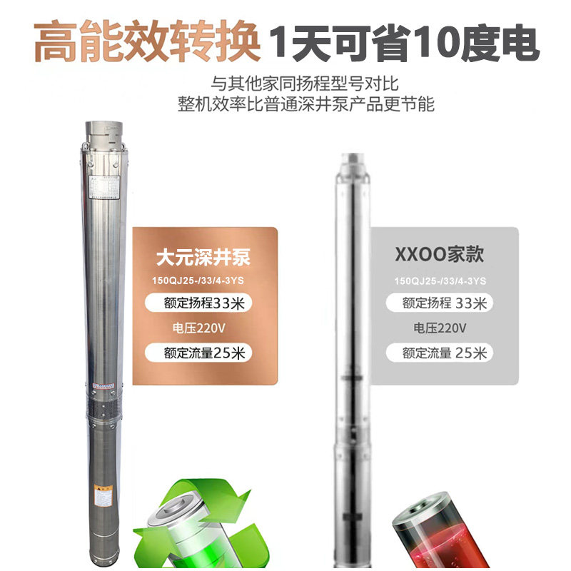 大元 45方家用农用高扬程灌溉抽水泵 不锈钢三相150QJ深井潜水泵25由