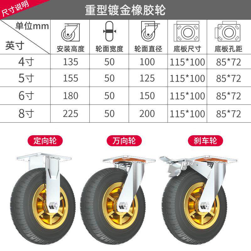 为您提供商品6寸万向轮重型静音橡胶脚轮定带轴458寸板车轮子3寸4寸承重实心的详细介绍,