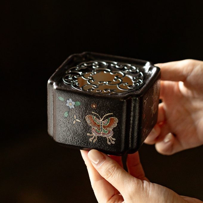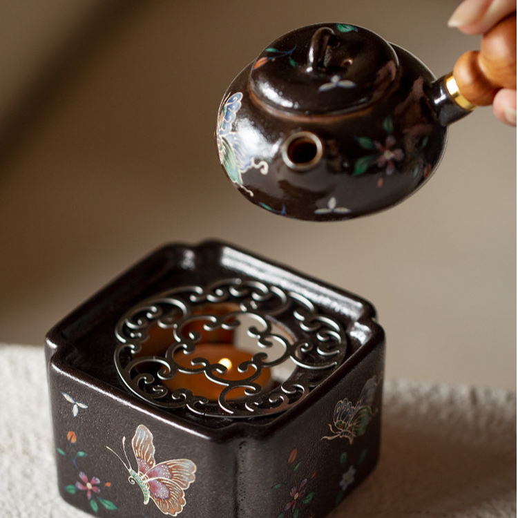 亘古 陶瓷温茶炉 暗夜蝶舞黑志野烧粗陶温茶炉底座酒精炉围炉中式