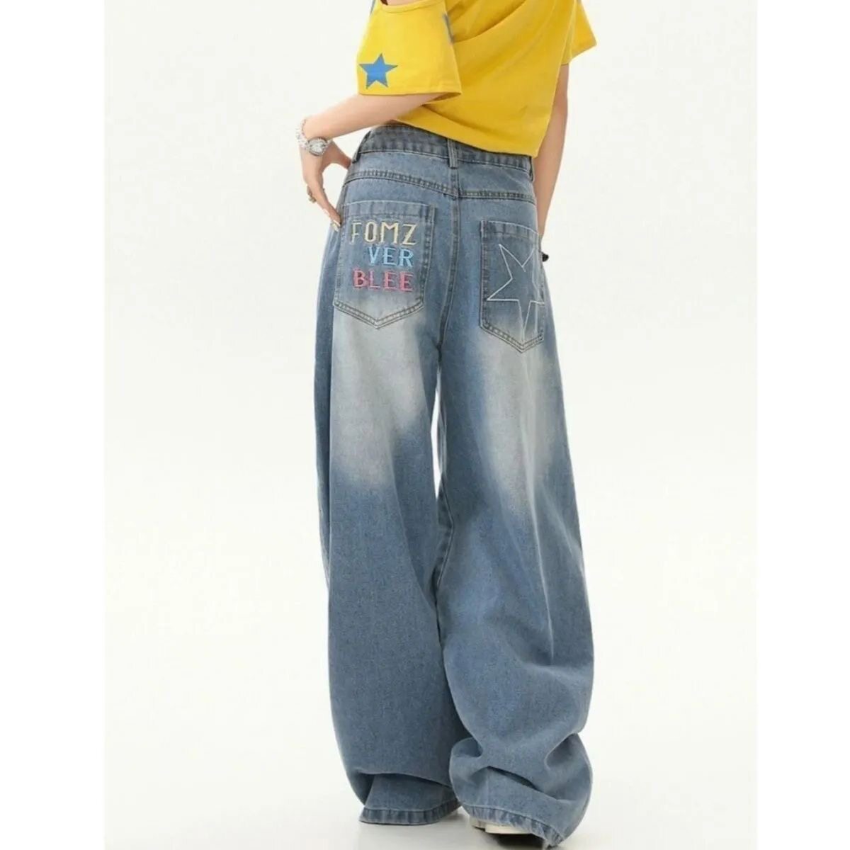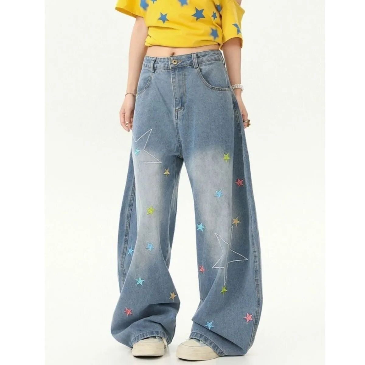 街舞个性 美式 水洗彩色星星绣花牛仔裤 女款 设计感宽松百搭阔腿长裤
