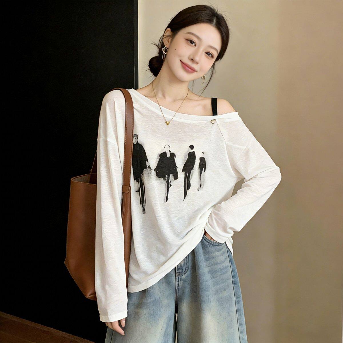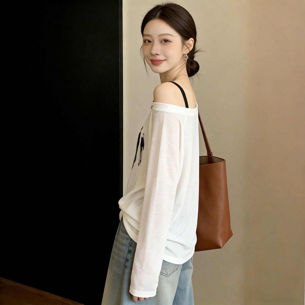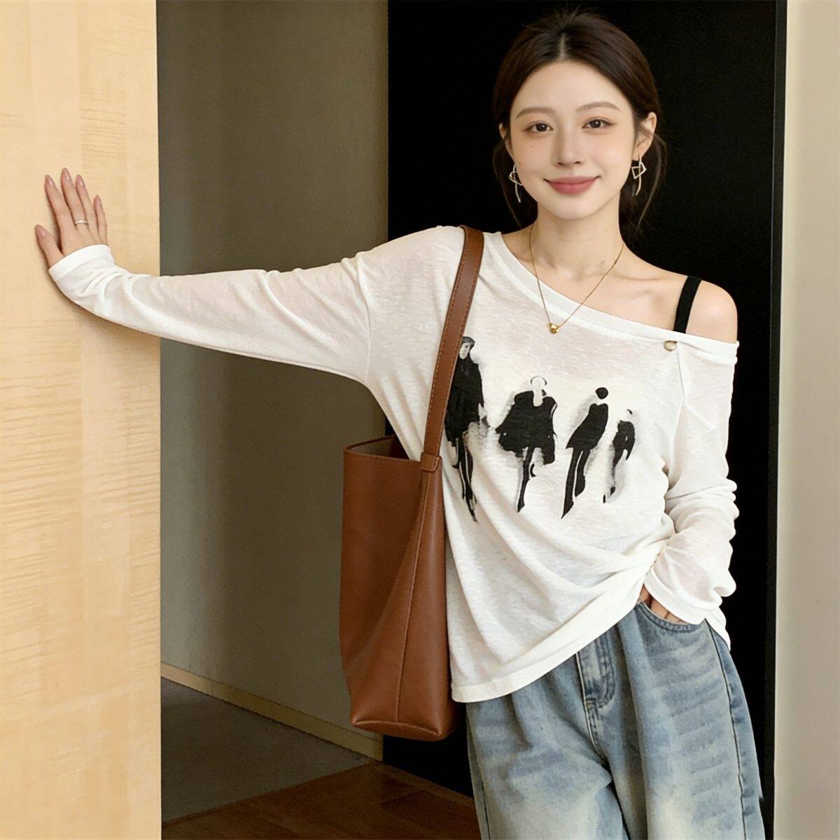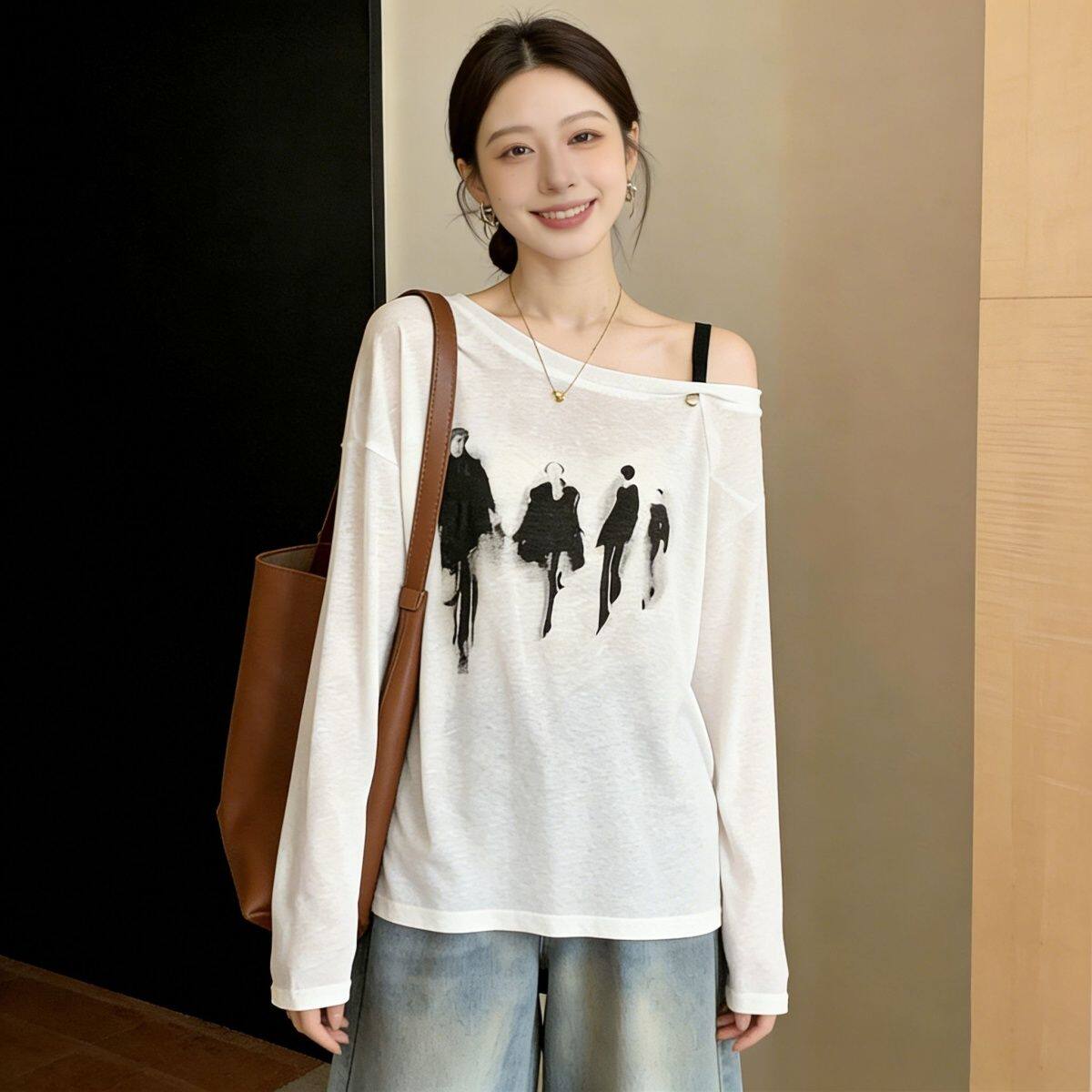 白色印花斜领吊带长袖 微胖mm大码 夏季 镂空露肩上衣 t恤女春夏新款由