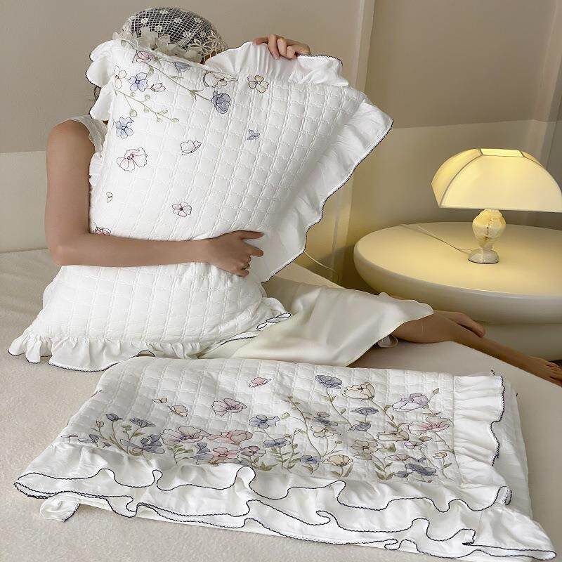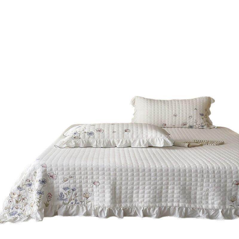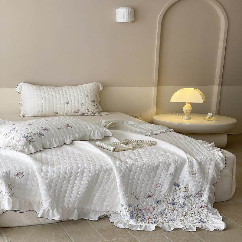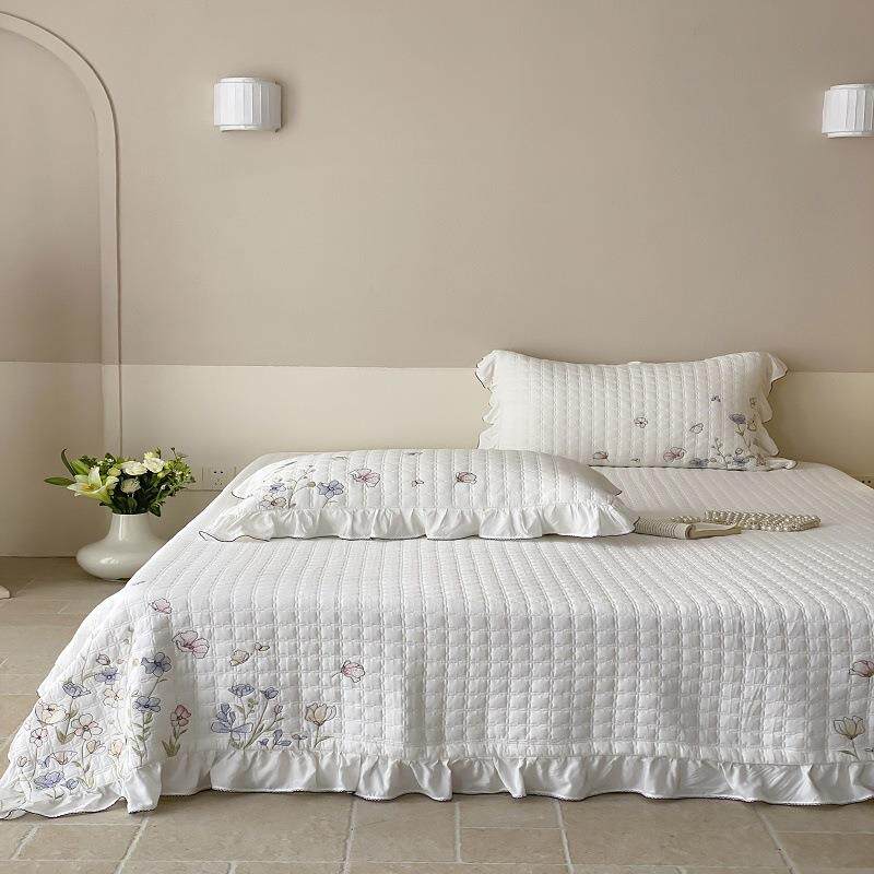 60S莫代尔天丝公主风荷叶花边刺绣夹棉绗缝床盖三件套防滑床单垫
