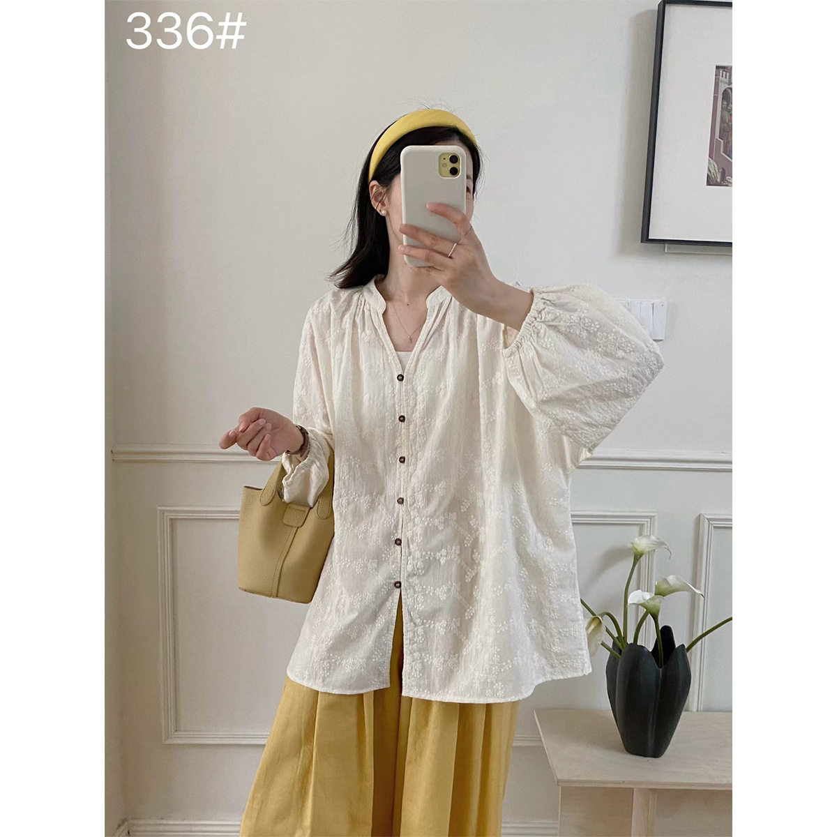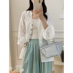 百搭温柔风衬衫 上衣 刺绣衬衣韩国东大门夏季 文艺半开襟木扣泡泡袖由