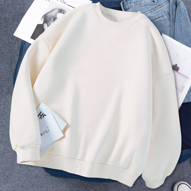 洋气上衣套头加厚绒衫 潮 全棉修身 即墨杏色圆领正肩卫衣女加绒冬季