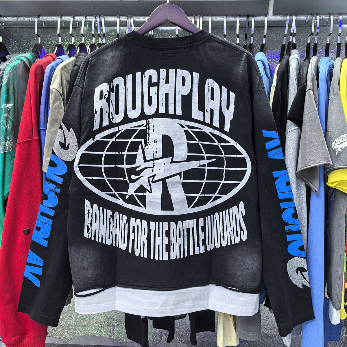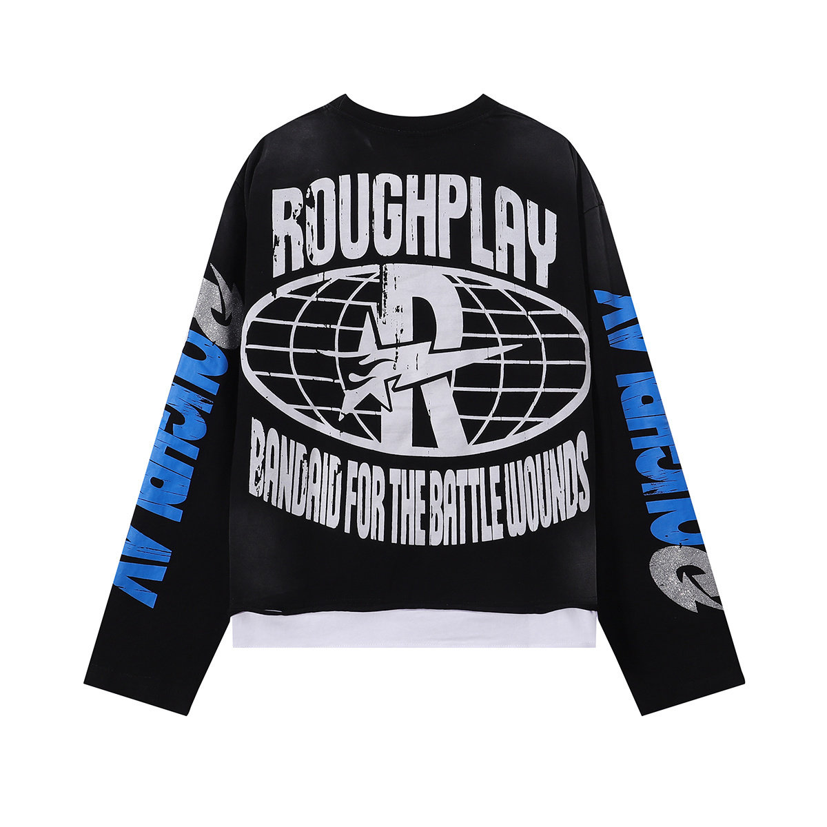 Rough 潮牌复古骷髅人洗水拼接破洞ins超火纯棉T恤长袖 衫 Play美式由