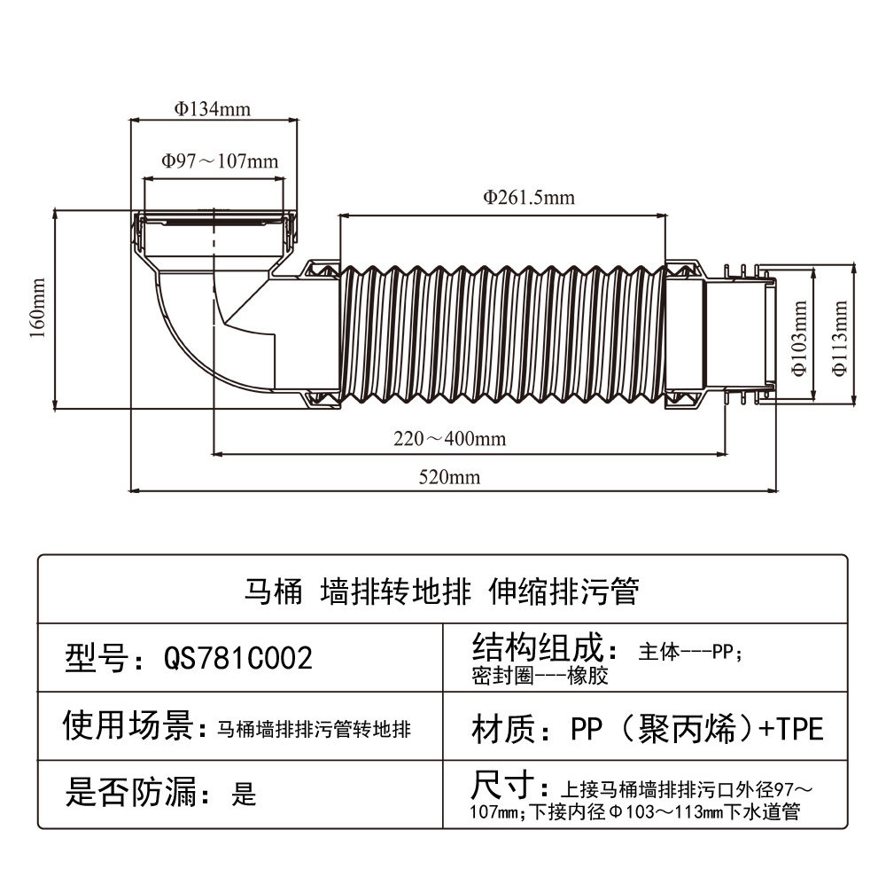 为您提供商品天力马桶墙排排污管 加大口径加厚管壁QS781 墙排改地排伸缩管的详细介绍,