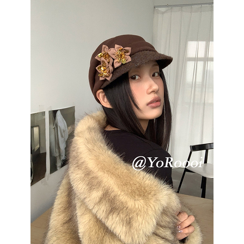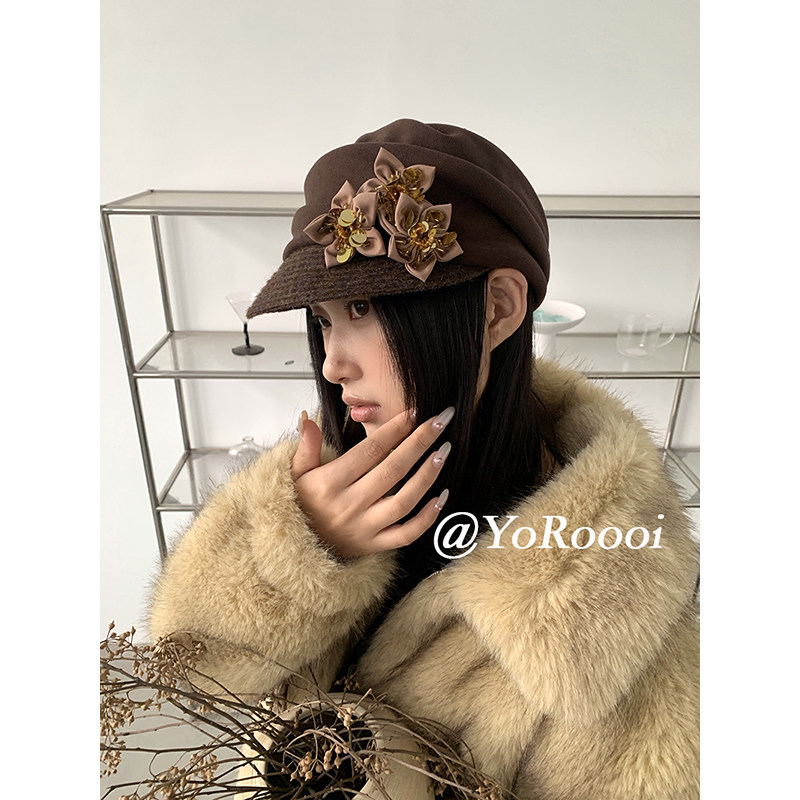 新款 花朵褶皱韩系温柔报童帽显脸小鸭舌帽马术帽 自制冬季 YoRoooi