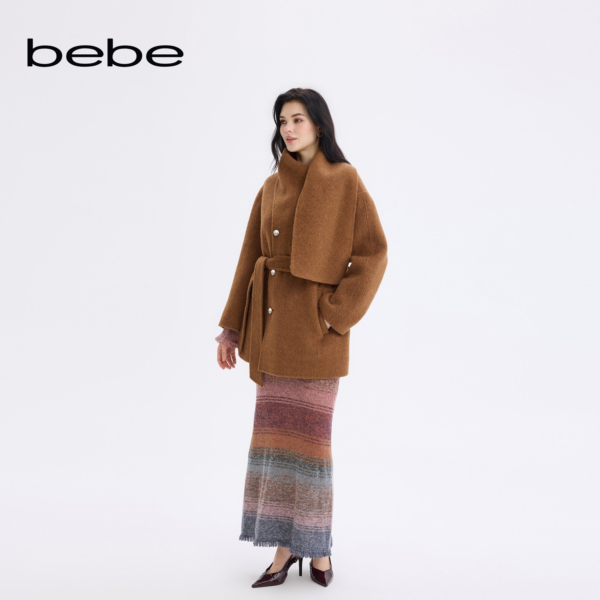 bebe2025秋冬新款 围巾领焦糖色毛呢大衣472205 女士含羊毛围裹式