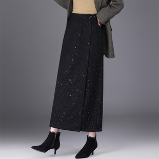 开叉长裙围裹式 遮胯亮片直筒裙 毛呢半身裙女秋冬2025年新款 一片式