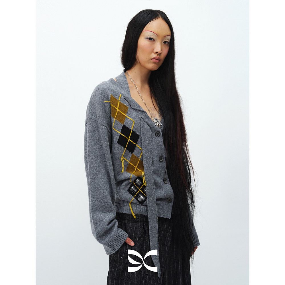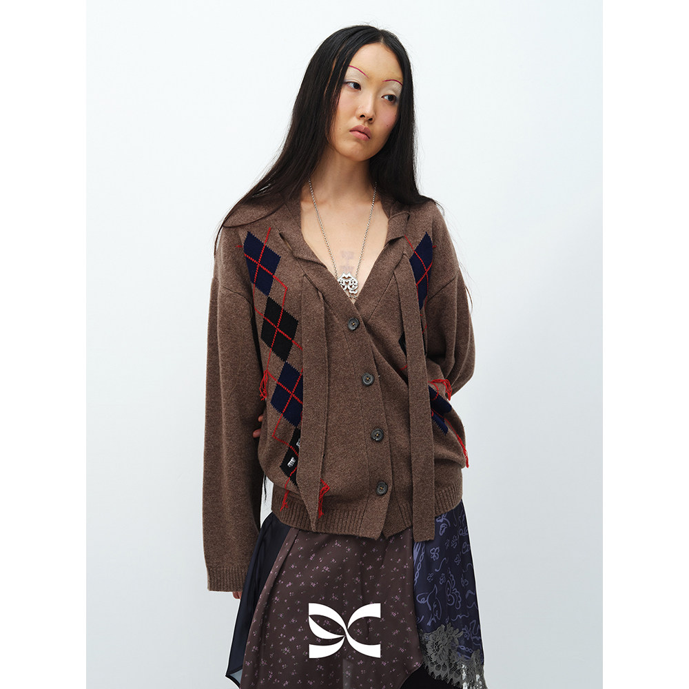 方圆羊毛复古格纹菱格V领穿绳飘带慵懒感毛衣开衫 CIRCLE SQUARE