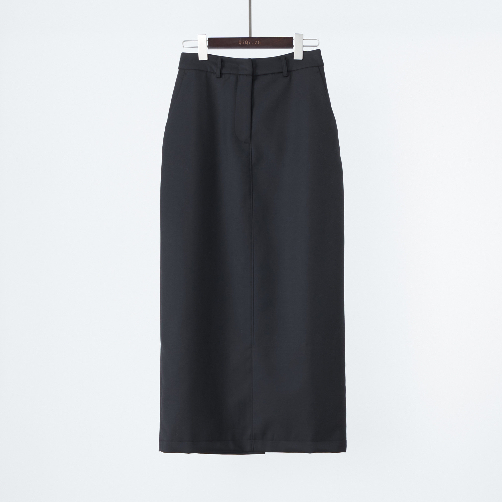 黑色西装 高级显瘦 精纺羊毛 真丝内里后开衩高腰半身长裙 半身裙
