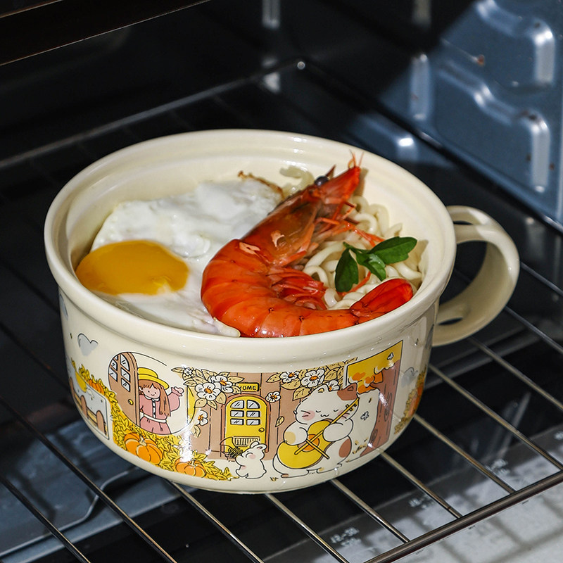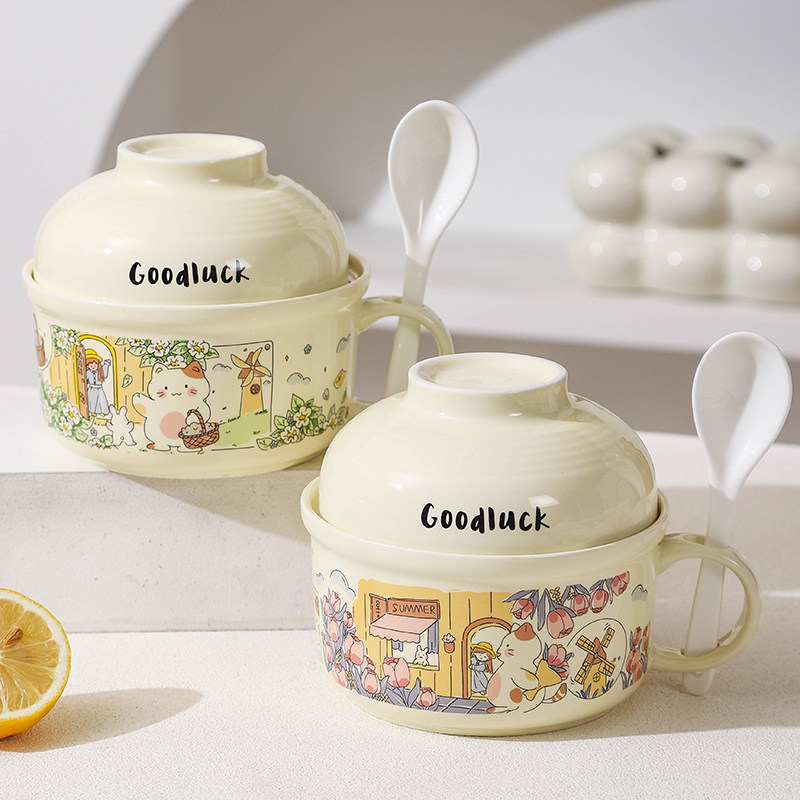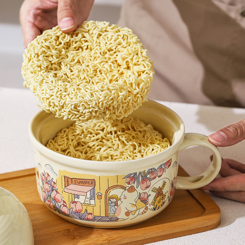 泡面碗带盖大容量陶瓷碗宿舍学生专用带把手打饭碗带手柄微波炉碗