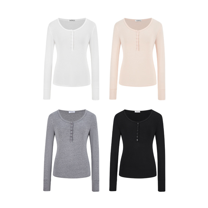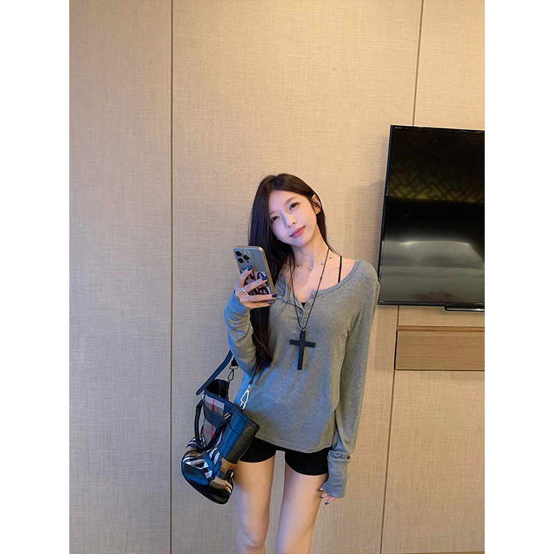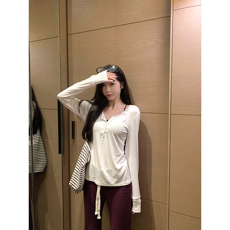 T恤秋修身 正肩内搭上衣 半开领纽扣长袖 MosesQueen魔西女王美式