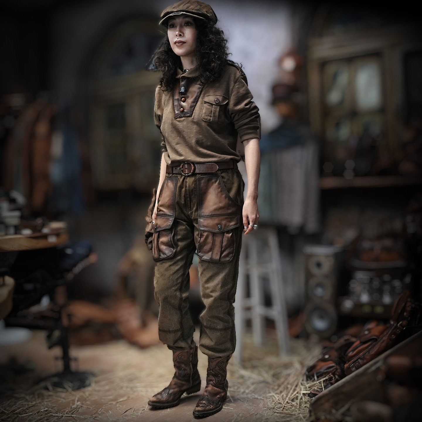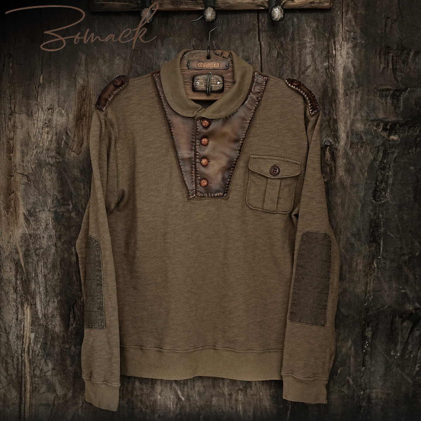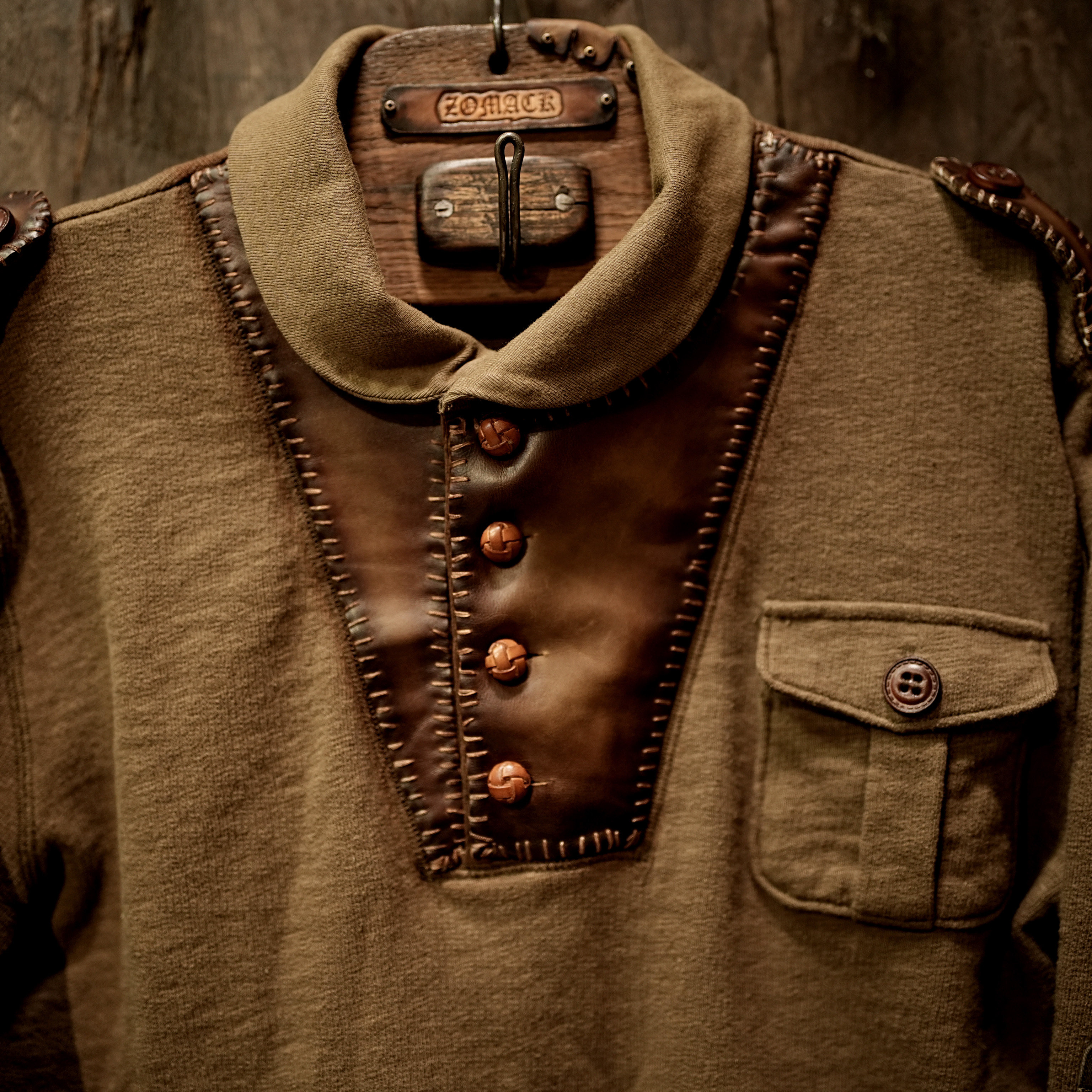 T恤打底衫 男军旅痞帅女 复古皮扣长袖 手工卫衣真皮拼接刺子工装