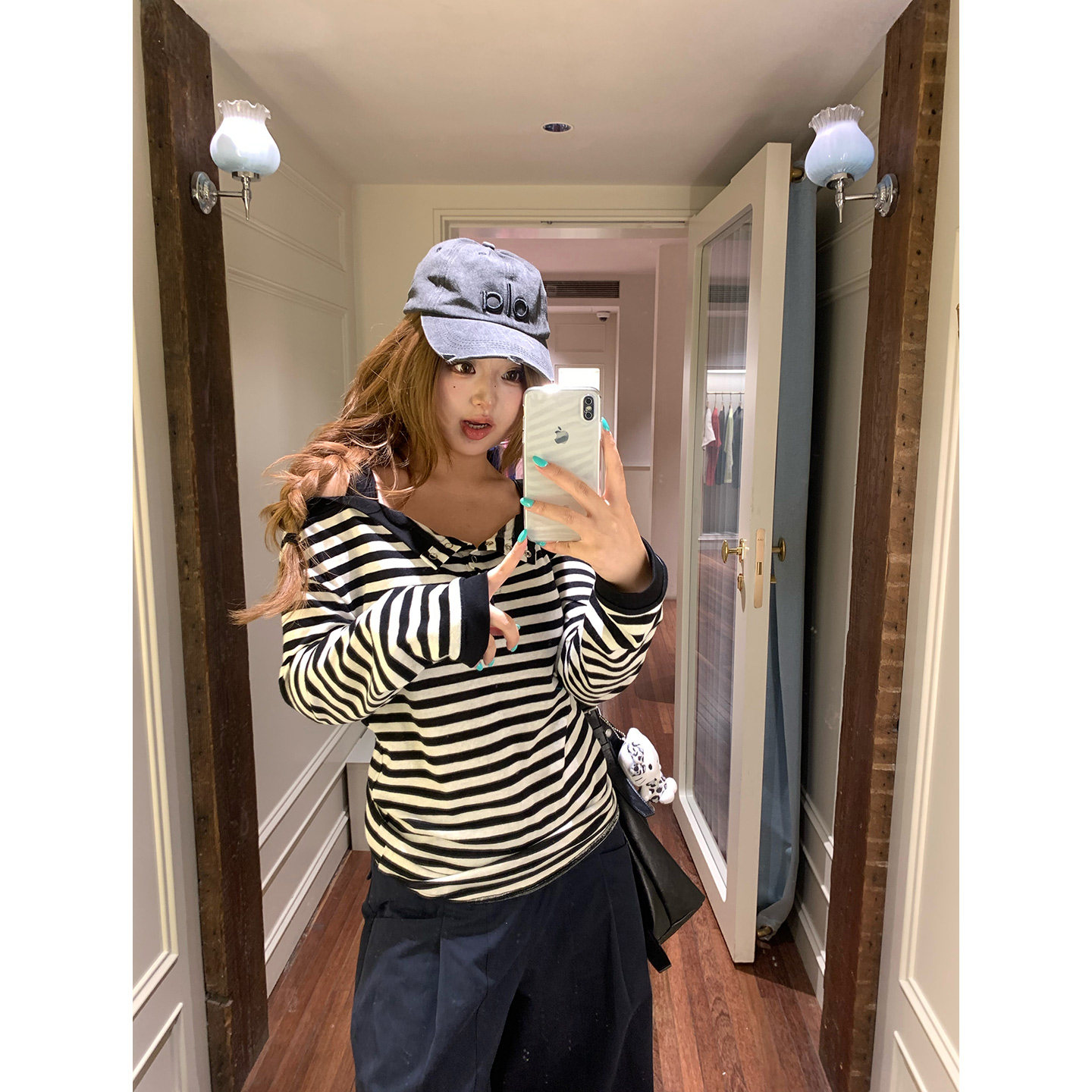 你 轻氧假日 韩系微胖mm日常百搭条纹露肩春夏长袖 T恤上衣 鱼由