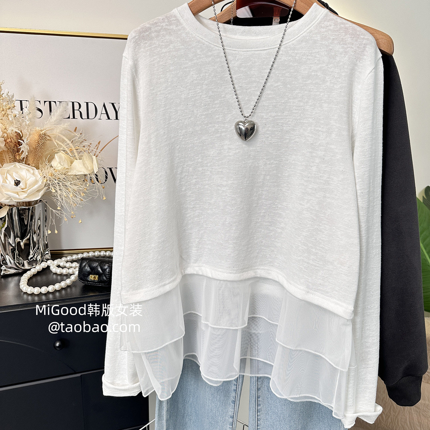 为您提供商品时尚 2026春季 新款 韩国净版 双层网纱拼接宽松雪花棉t恤女白色薄款的详细介绍,