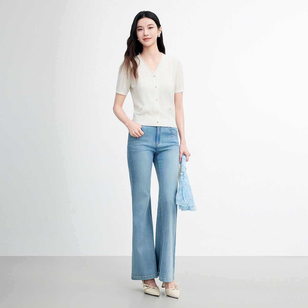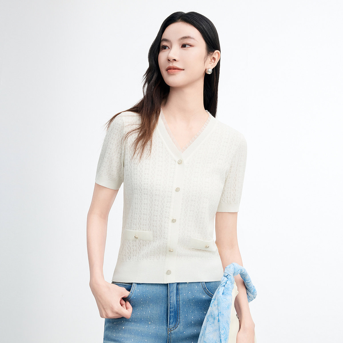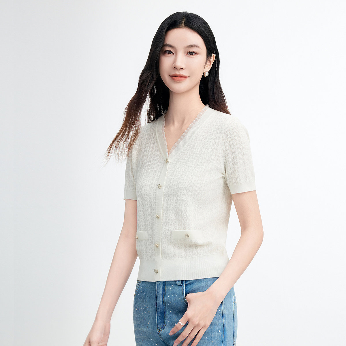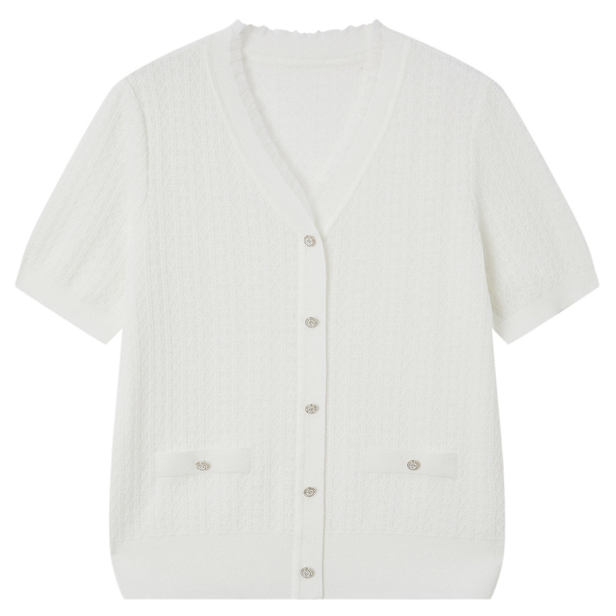 为您提供商品FINITY菲妮迪针织衫 新款 简约白色V领休闲花边上衣女装 2026年夏季的详细介绍,