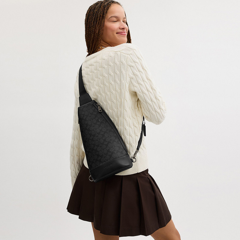 COACH 蔻驰潮流胸包男女同款 老花黑色单肩斜挎斜挎包 国内现货