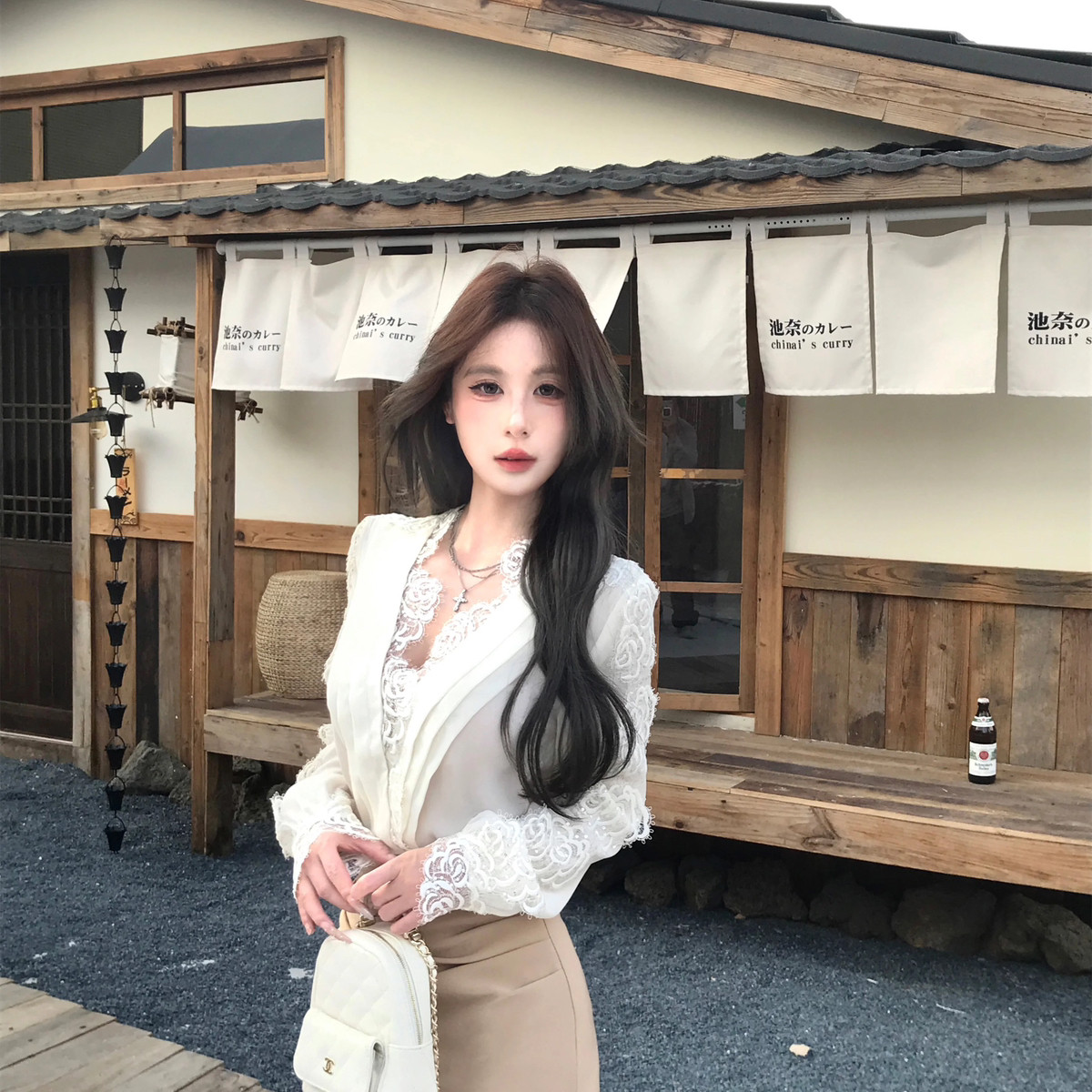 欲天花板纯欲风拼接玫瑰气质蕾丝V领衬衫 MEI 美姿 半身裙套装由
