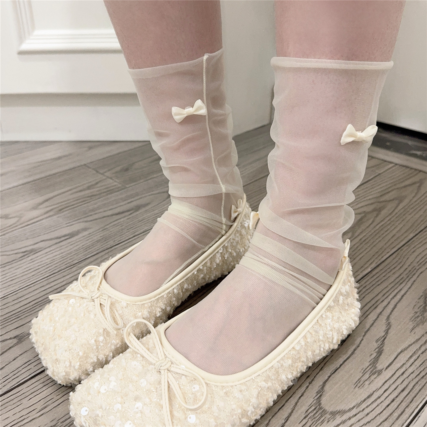 纯欲少女蝴蝶结超薄透明中筒袜夏杏色网纱袜百搭堆堆袜 AYTofilms