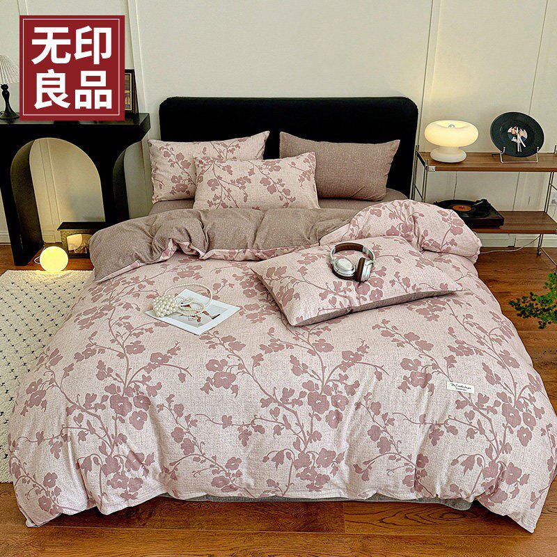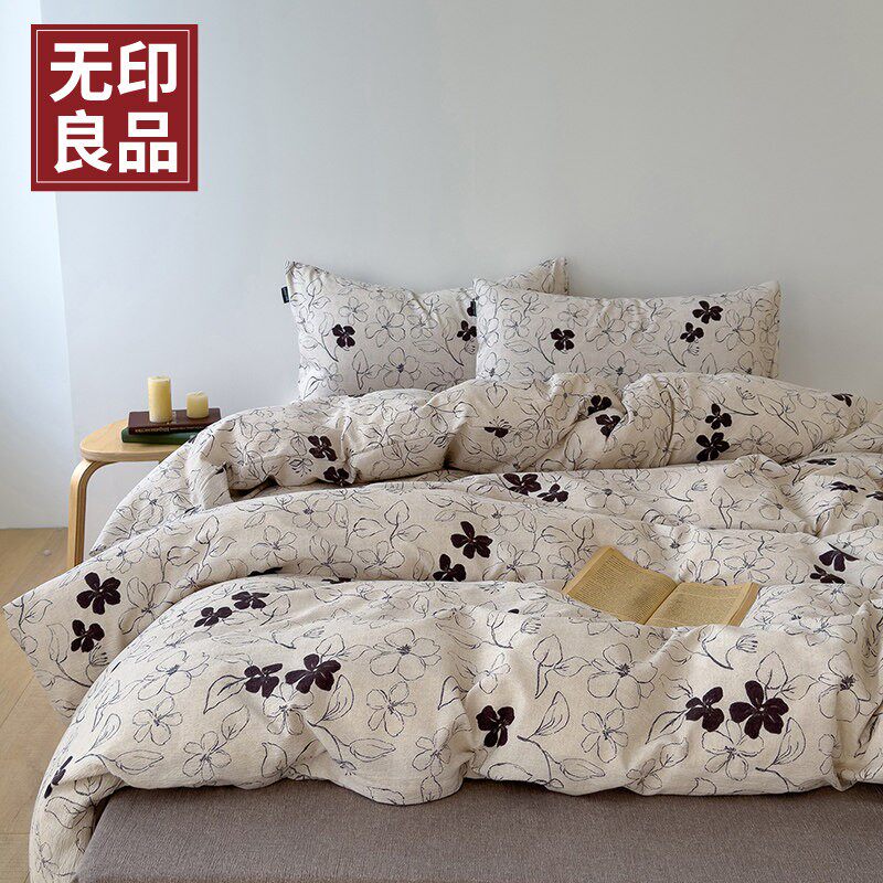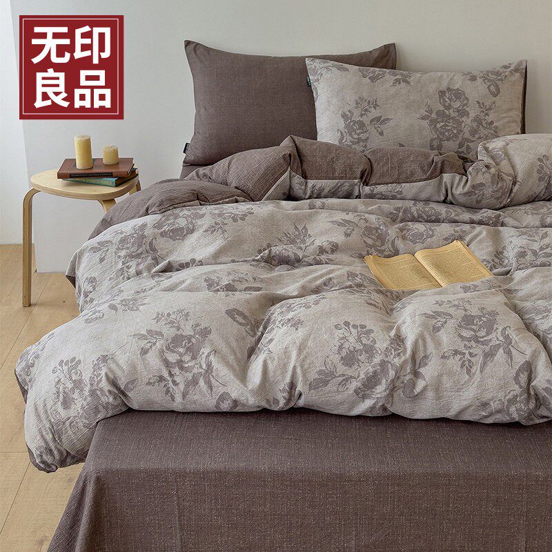 A类加厚高克重原麻复古风亚麻皱皱纱印花四件套 无印良品