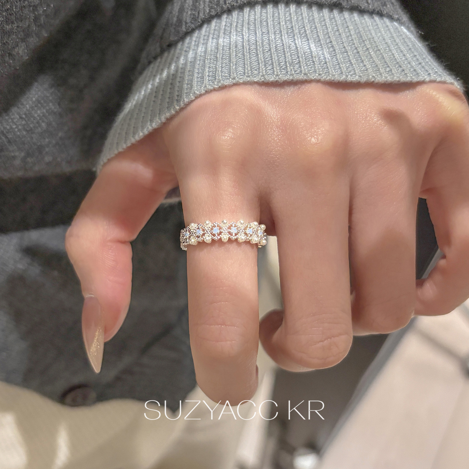 kr精致蕾丝仿珍珠合成锆石戒指复古气质小众食指戒指环女 suzyacc