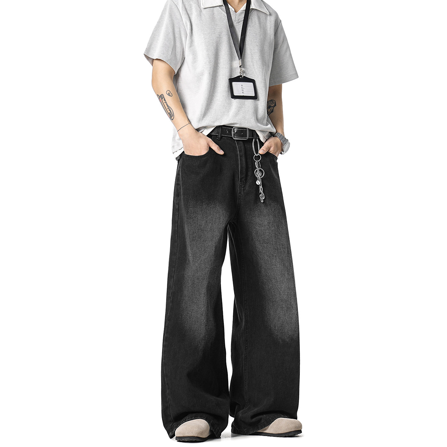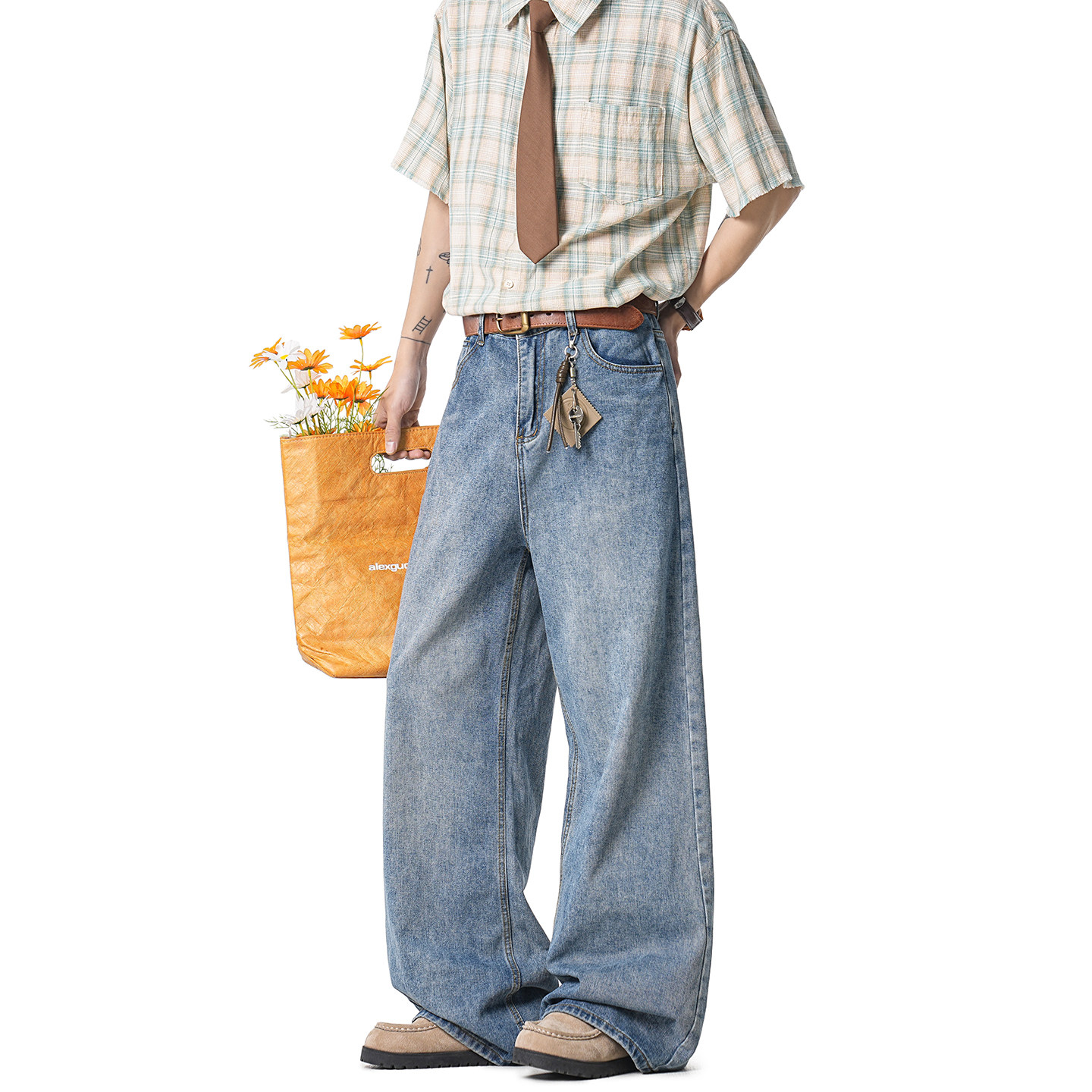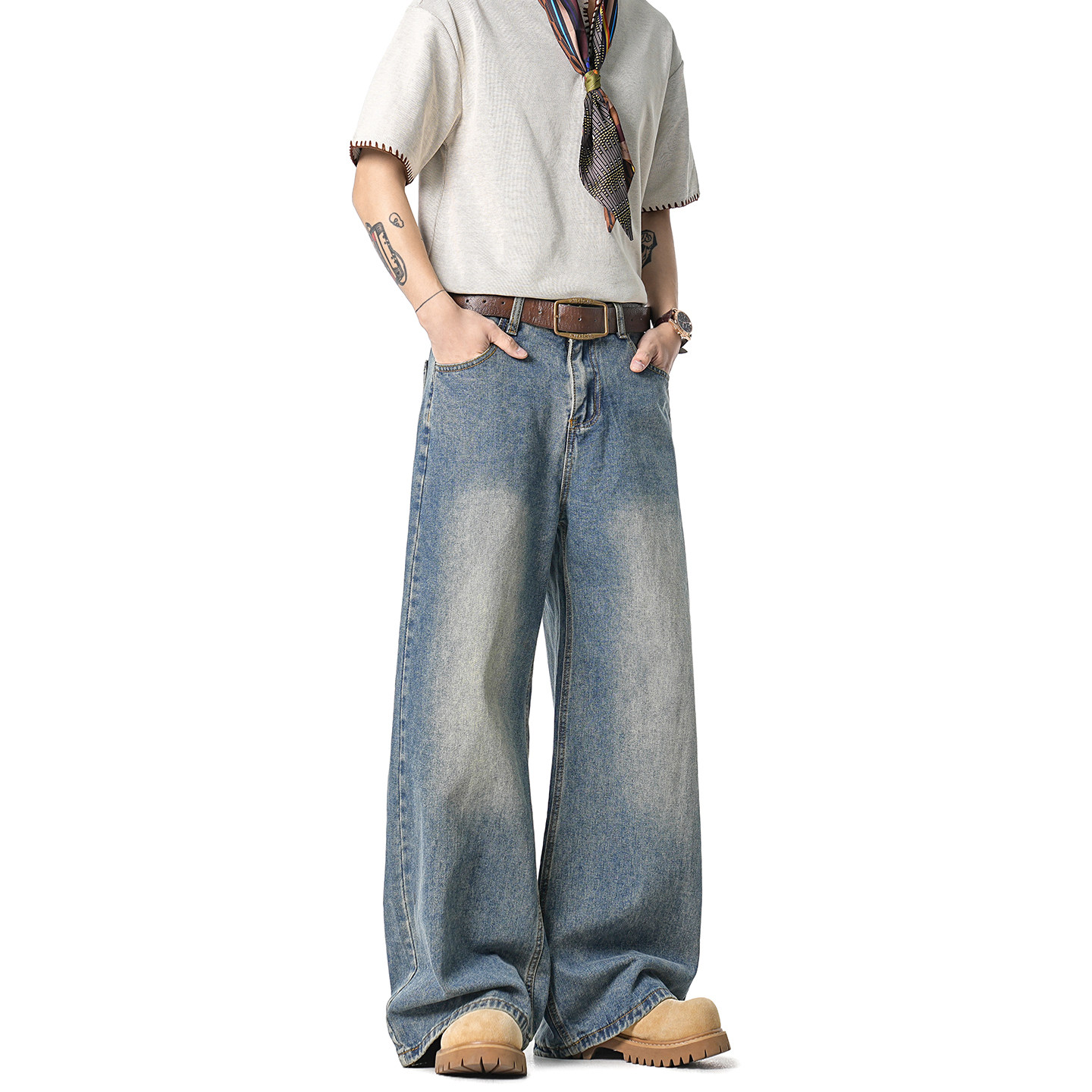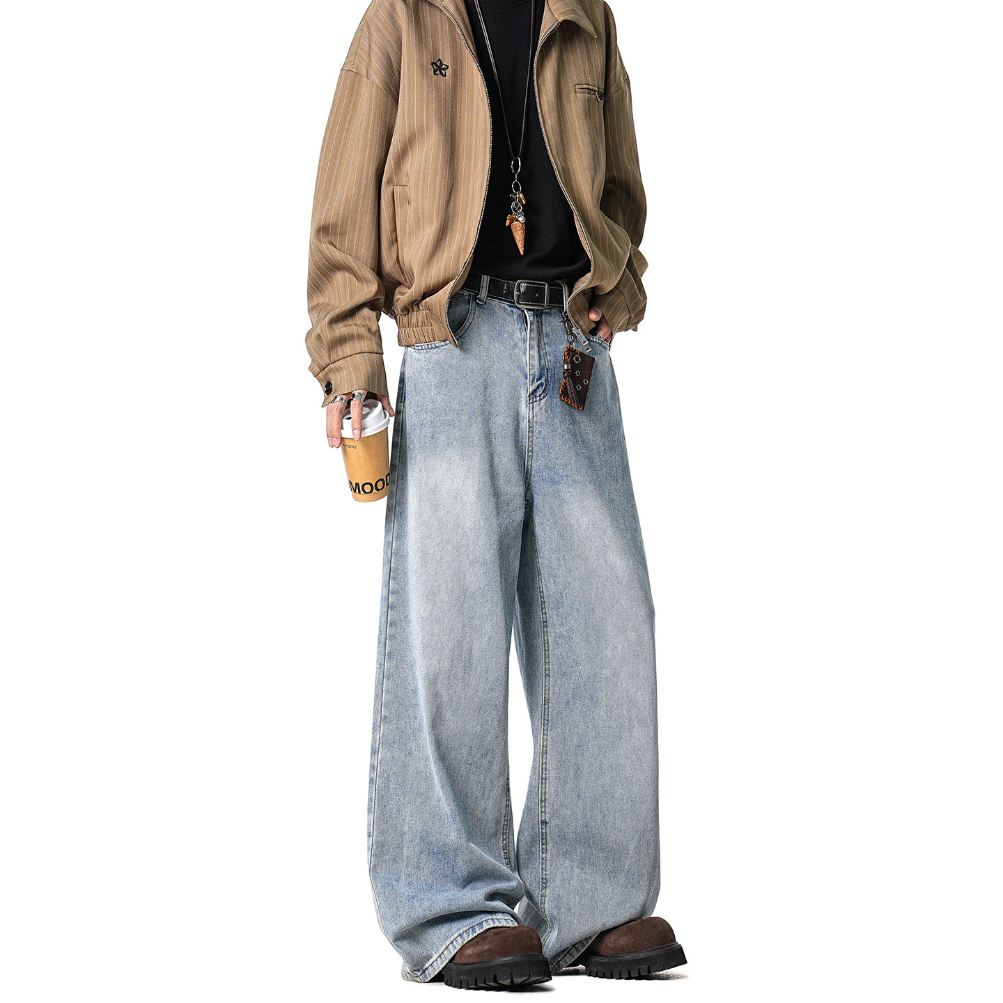 浅色水洗牛仔裤 GWIT 美式 垂感cleanfit春秋宽松直筒阔腿长裤 男士