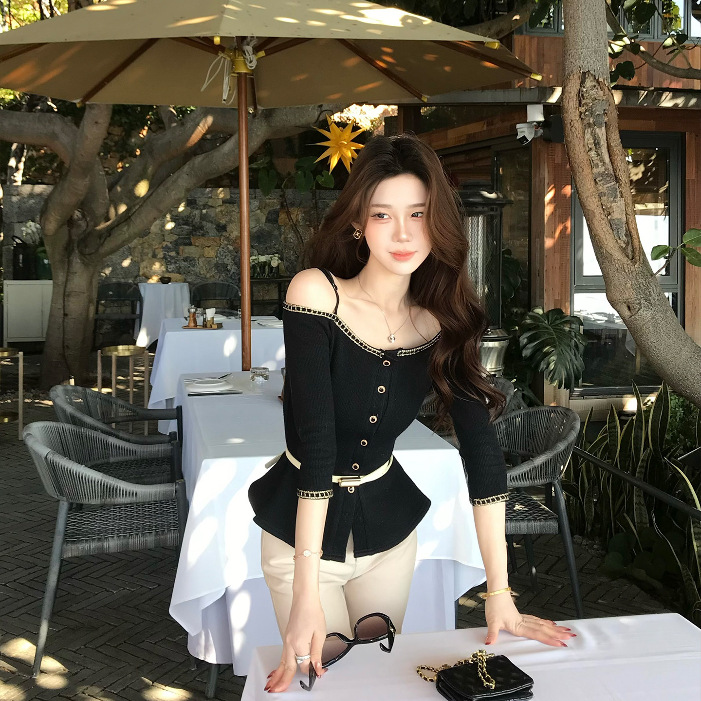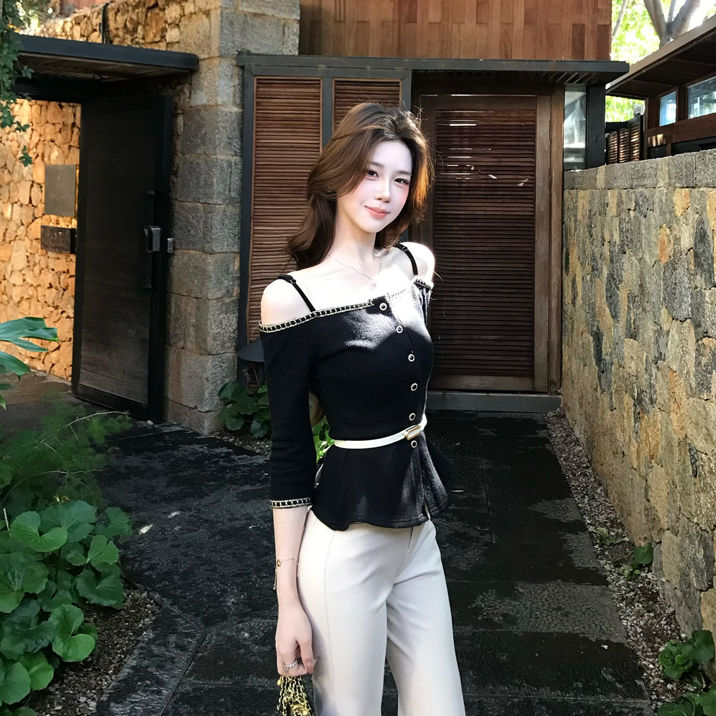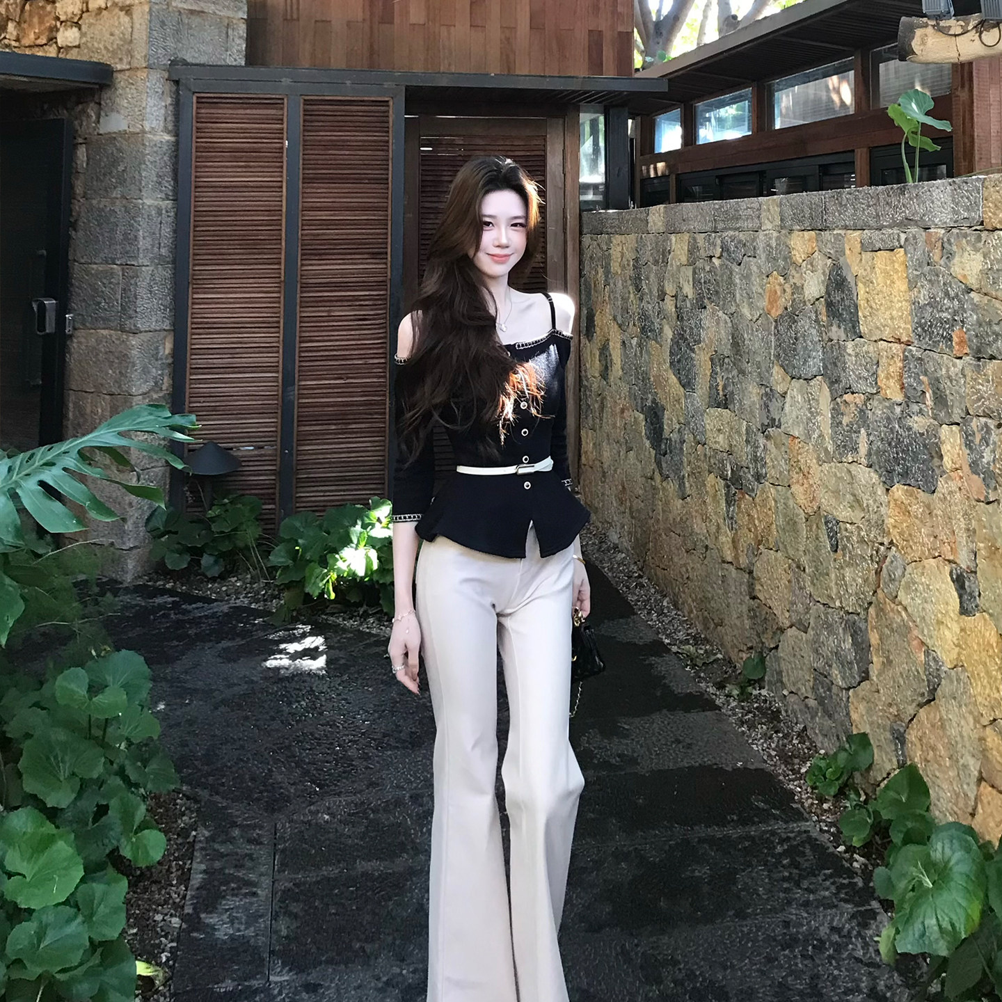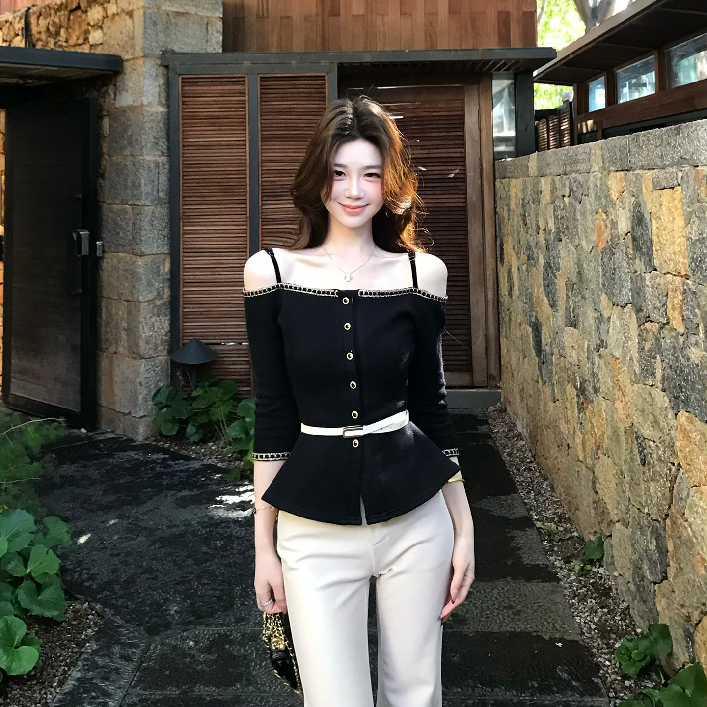 上衣女垂感微喇长裤 木子李 李轻熟风吊带一字肩针织衫 短款 夏 套装由
