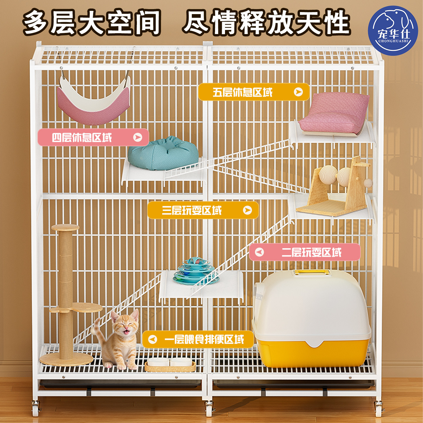宠华仕加粗加密猫笼子家用室内双层猫别墅带厕所超大自由空间猫窝