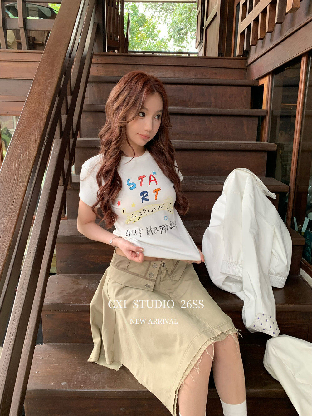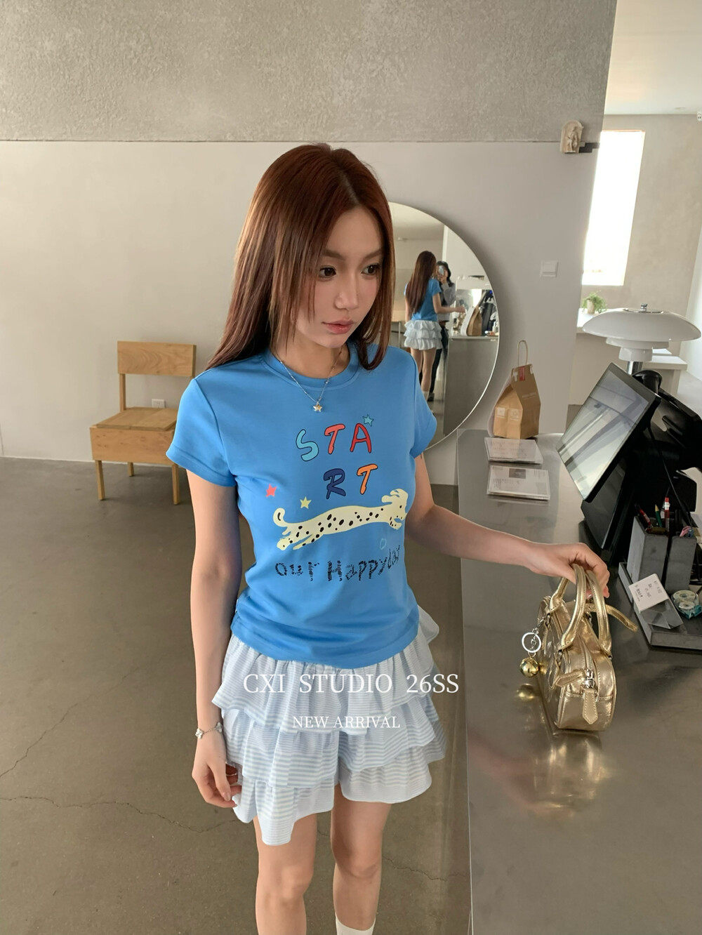 韩系时尚 CXI正版 2026春季 新款 T恤女 ins小众彩色小狗图案印花短袖