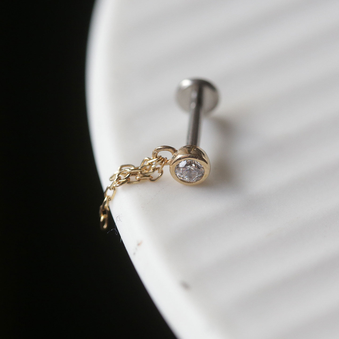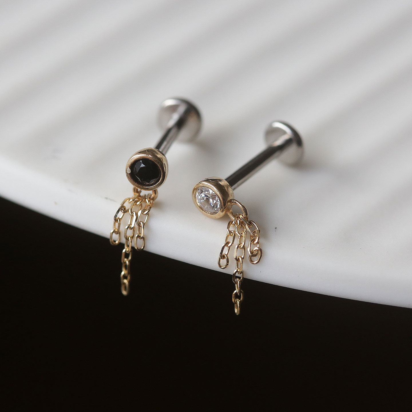 黑白包钻流苏坠平底耳骨钛钢底托拧螺丝耳钉 韩国10K金K黄金首饰由
