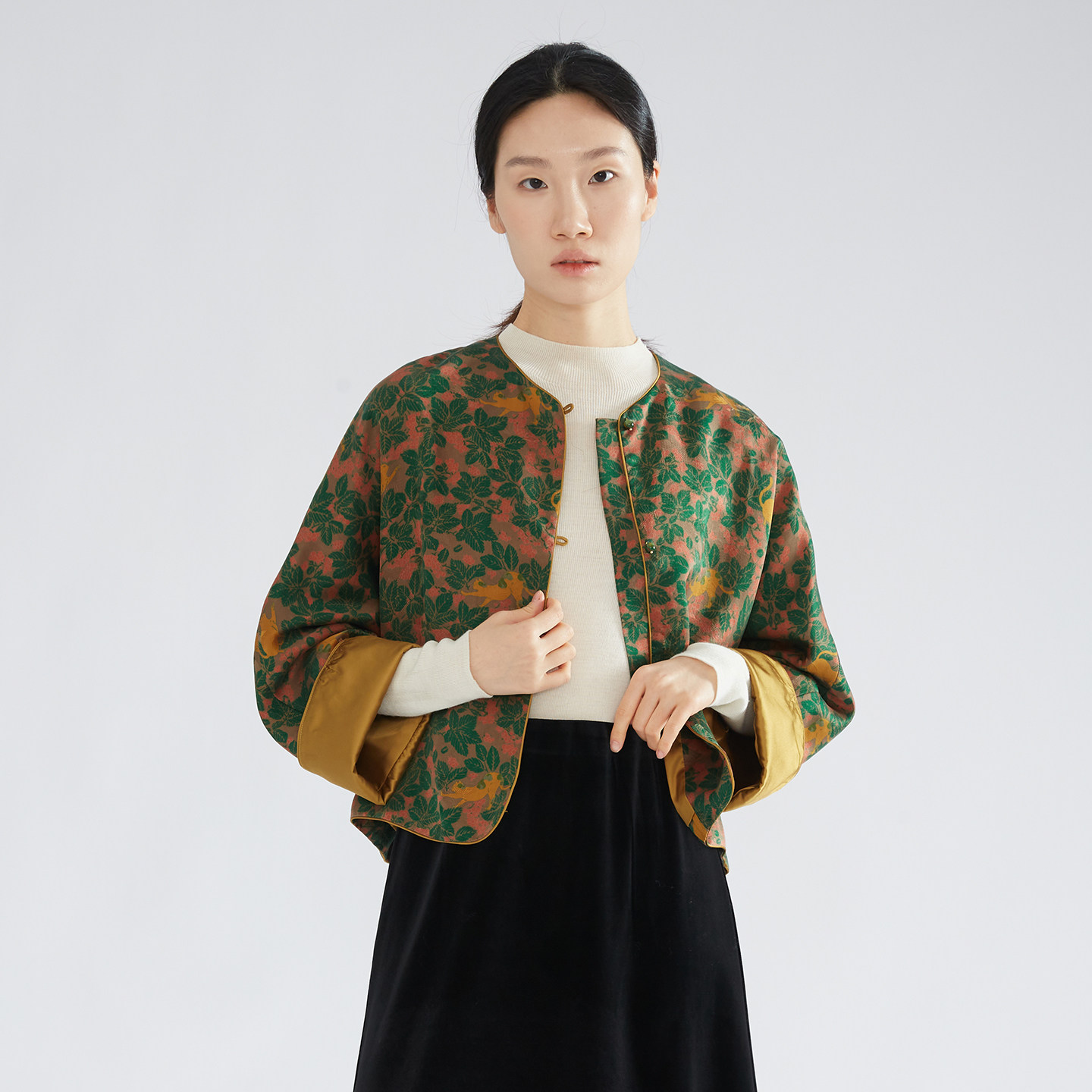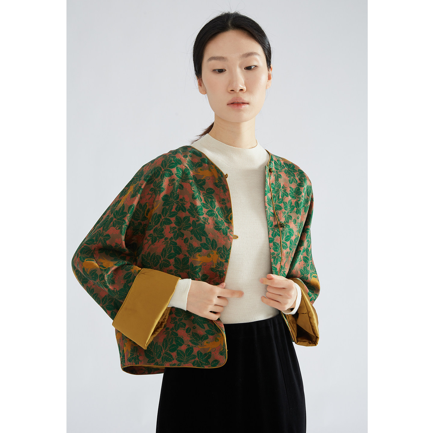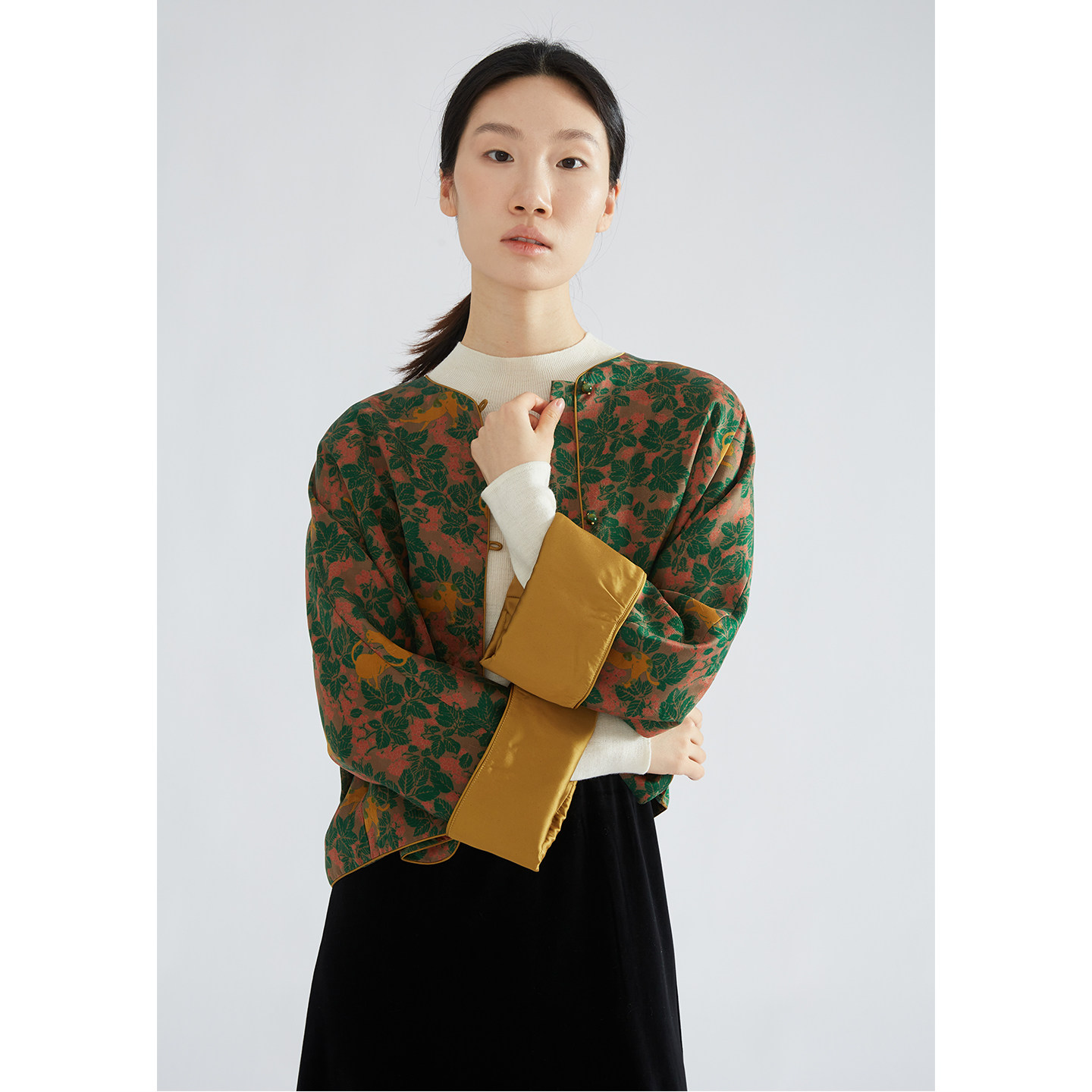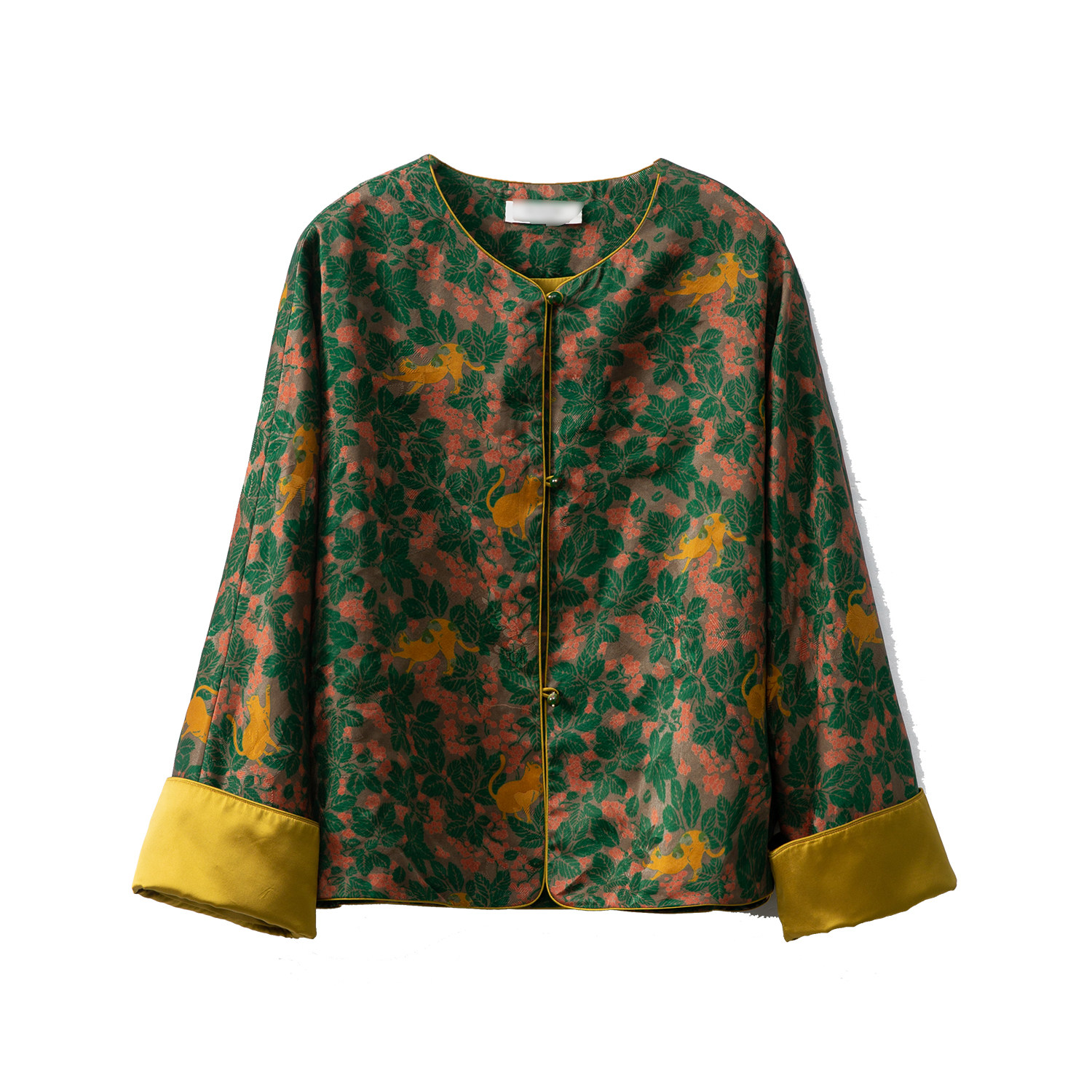 外套挽袖 圆领上衣女 100%桑蚕丝红云纱花萝国风印花真丝开衫 特惠由