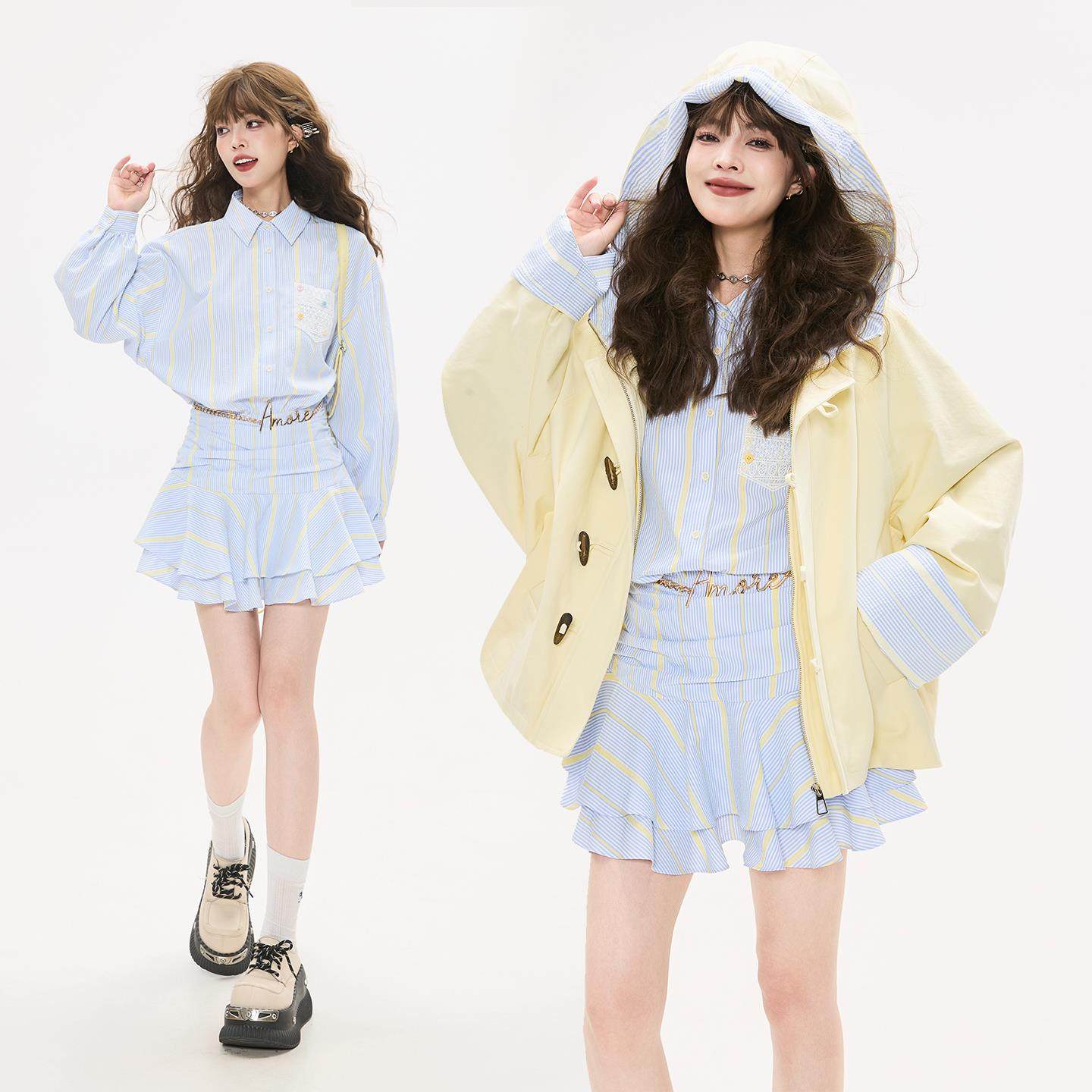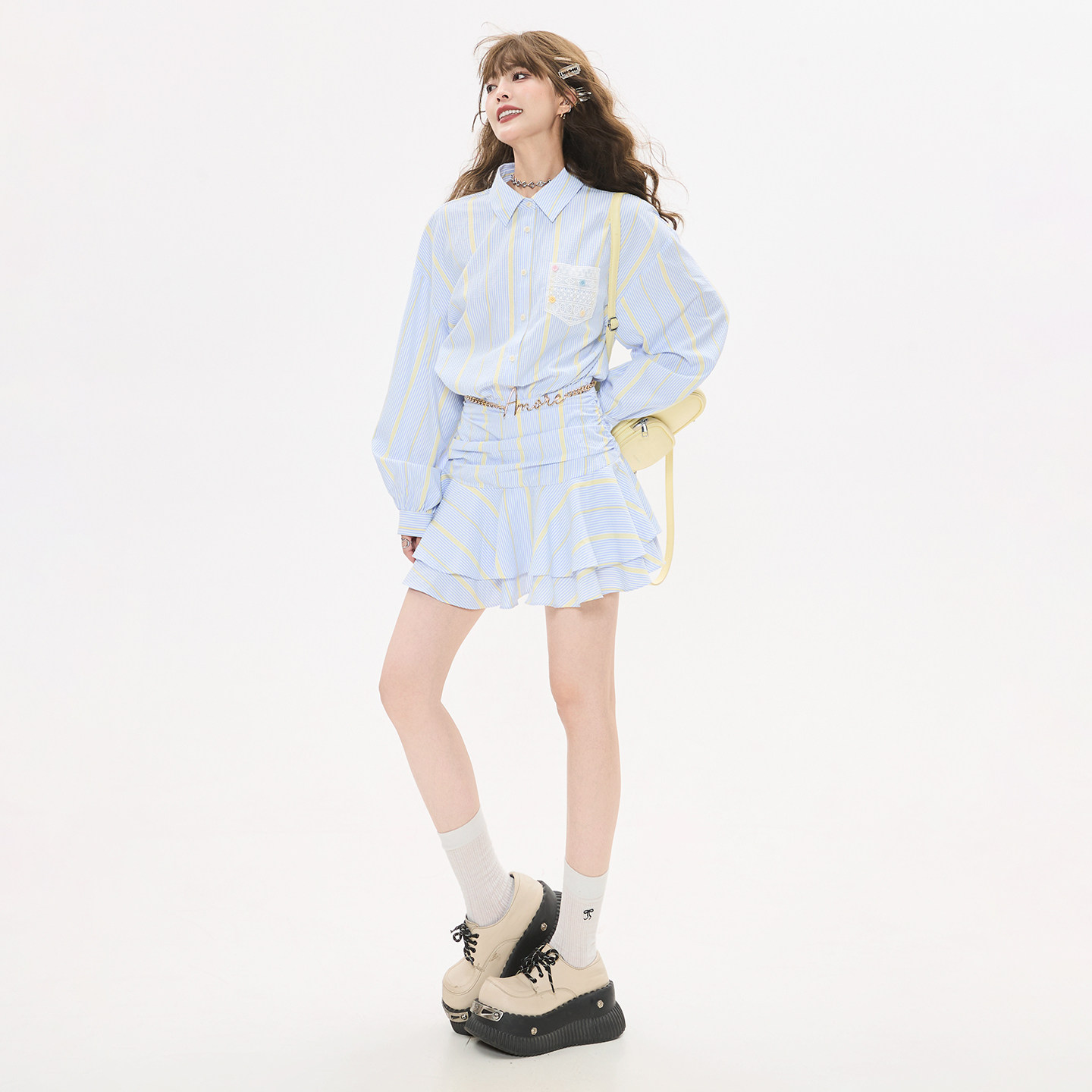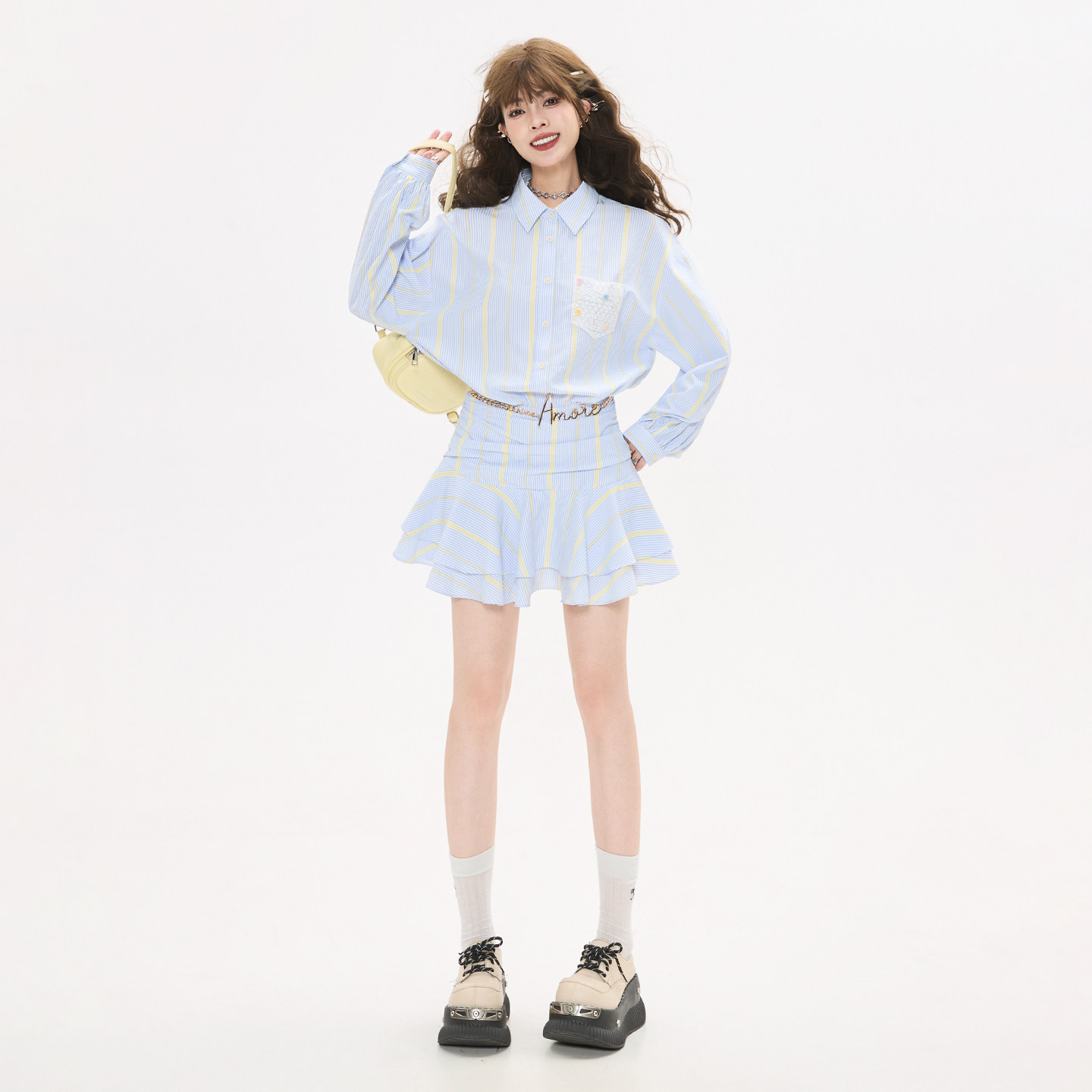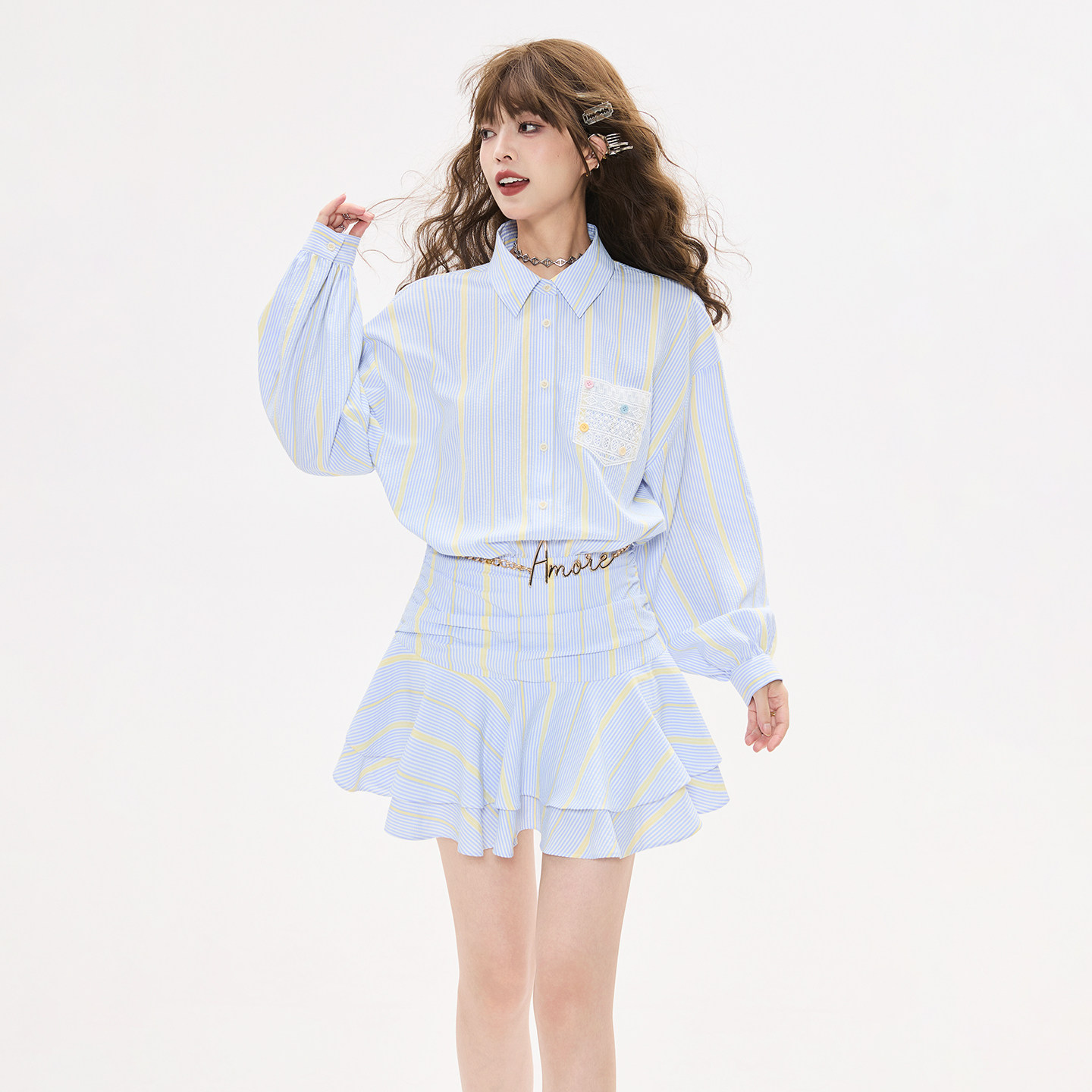KEIKO 连衣裙秋季 漂亮冷淡系小个子衬衫 裙子 轻淑感浅蓝色条纹长袖