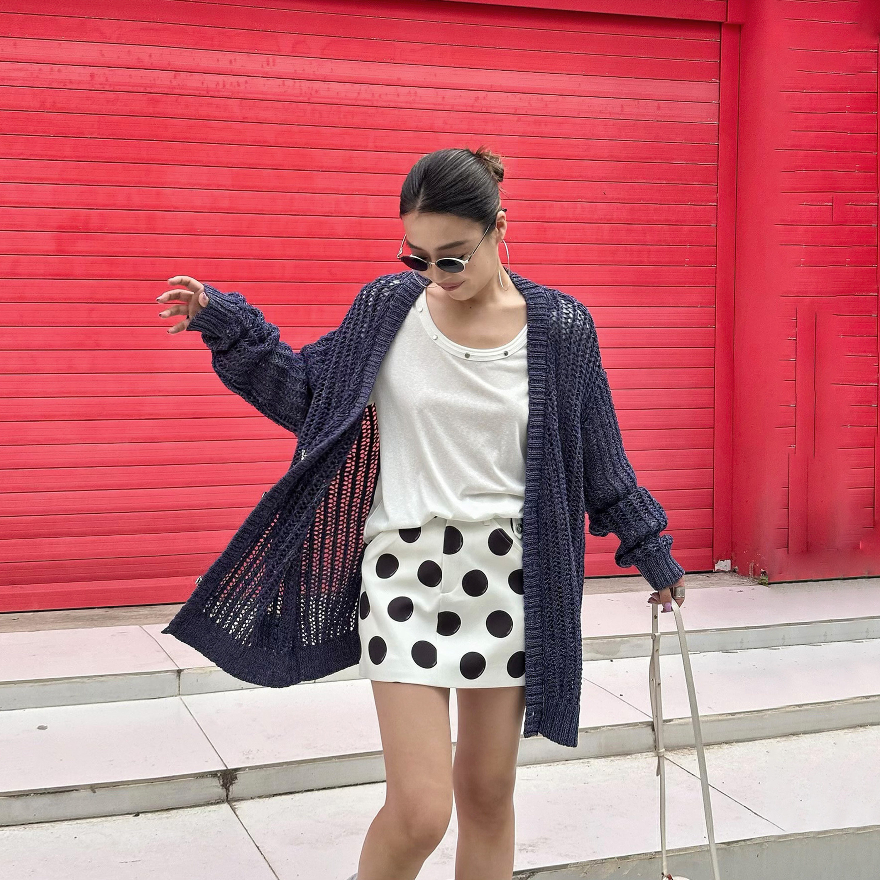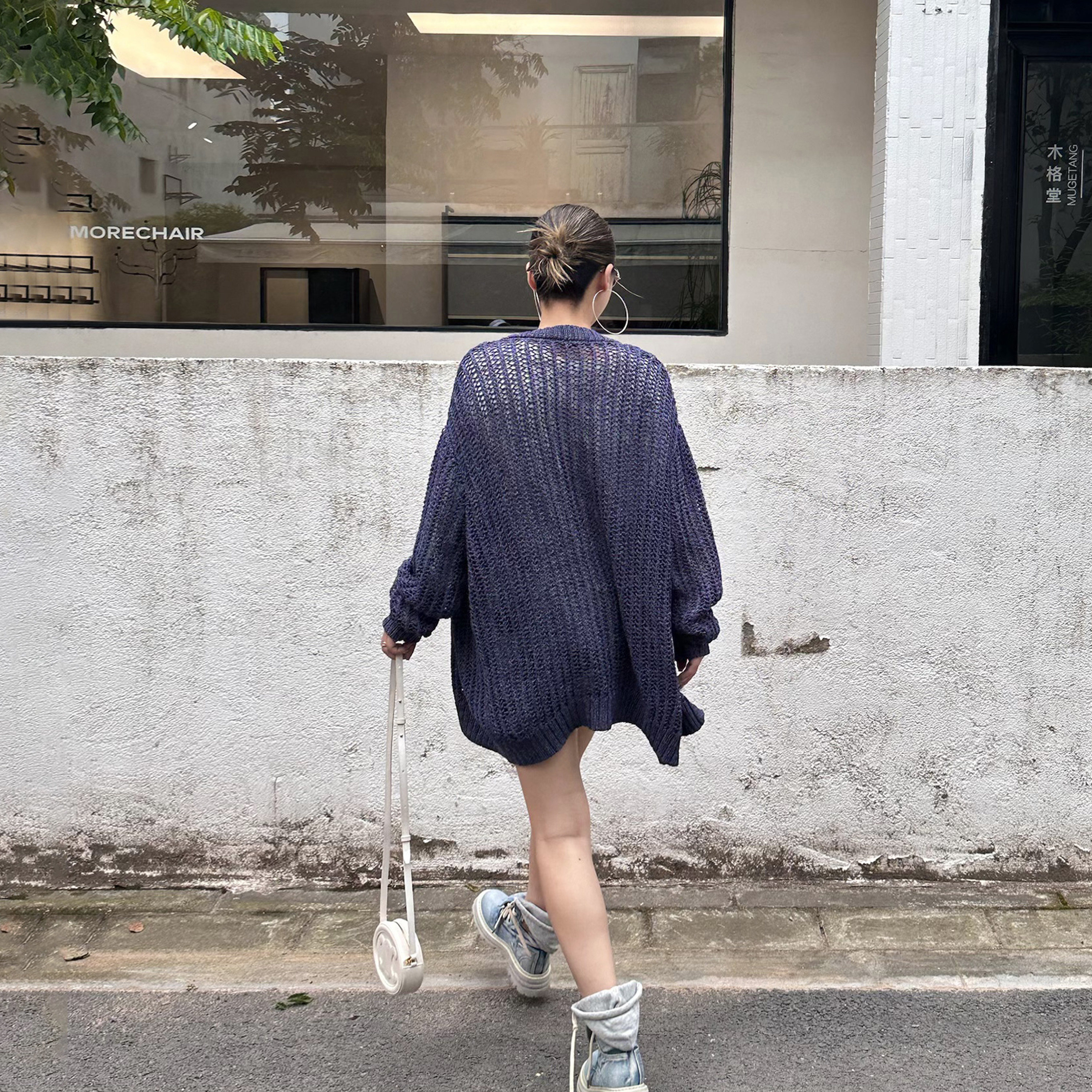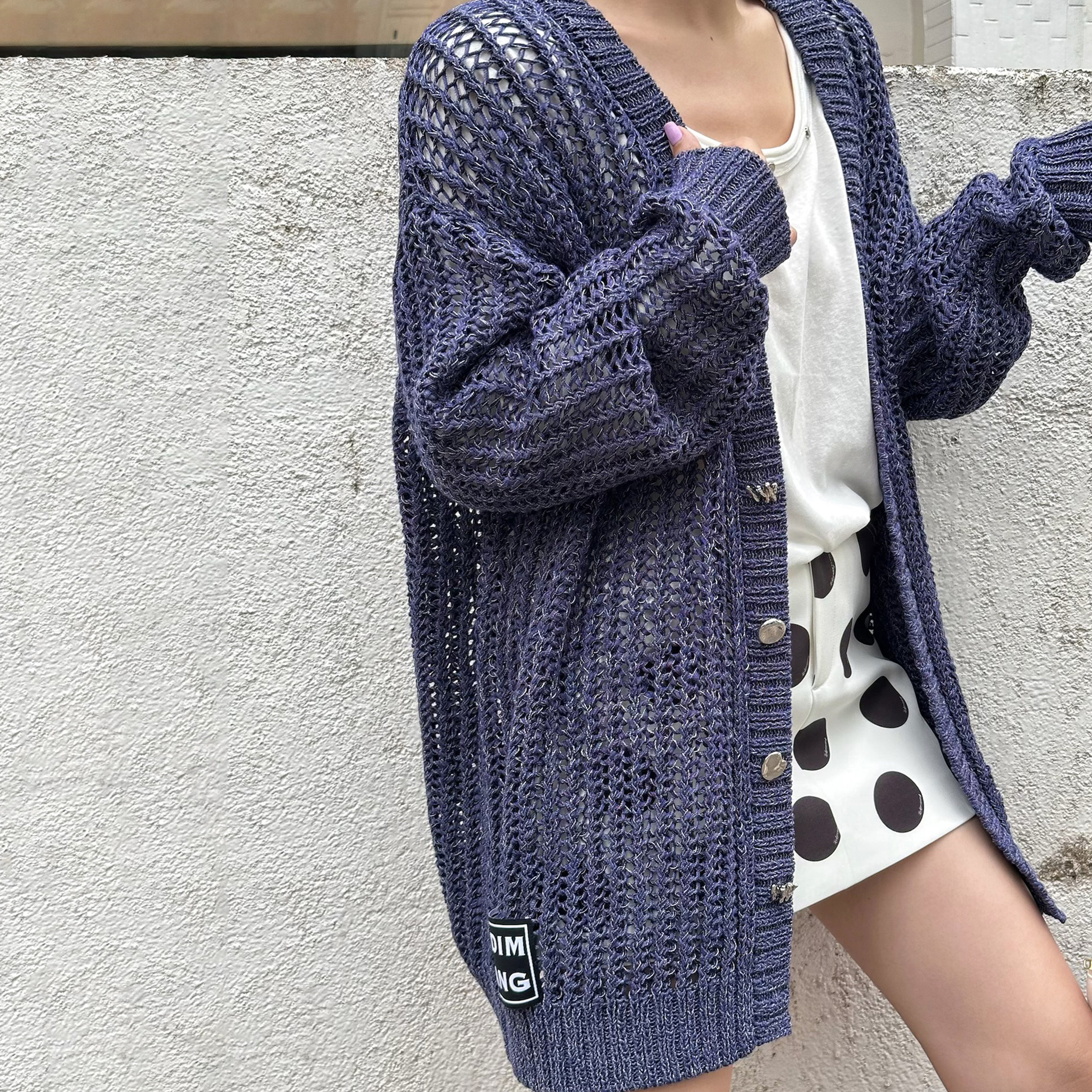 女秋新款 LEDIM WANG白标 牛仔色镂空针织衫 上衣 慵懒风直筒开衫