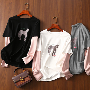 撞色假两件字母印花宽松圆领长袖 T恤女春新 新年限定小马T 淘么淘