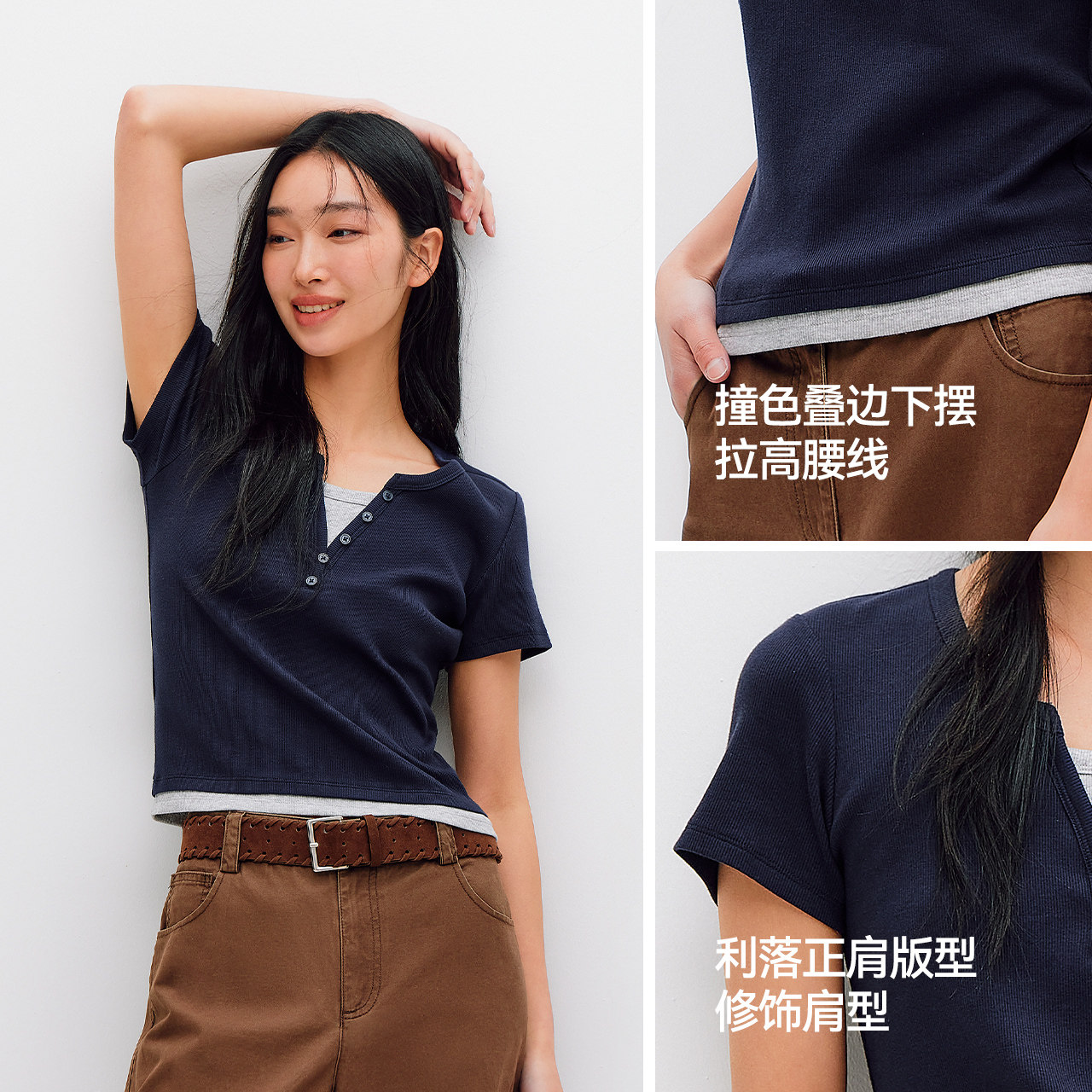 短款 商场同款 森马短袖 T恤女夏季 上衣 撞色假两件正肩紧身2026新款由