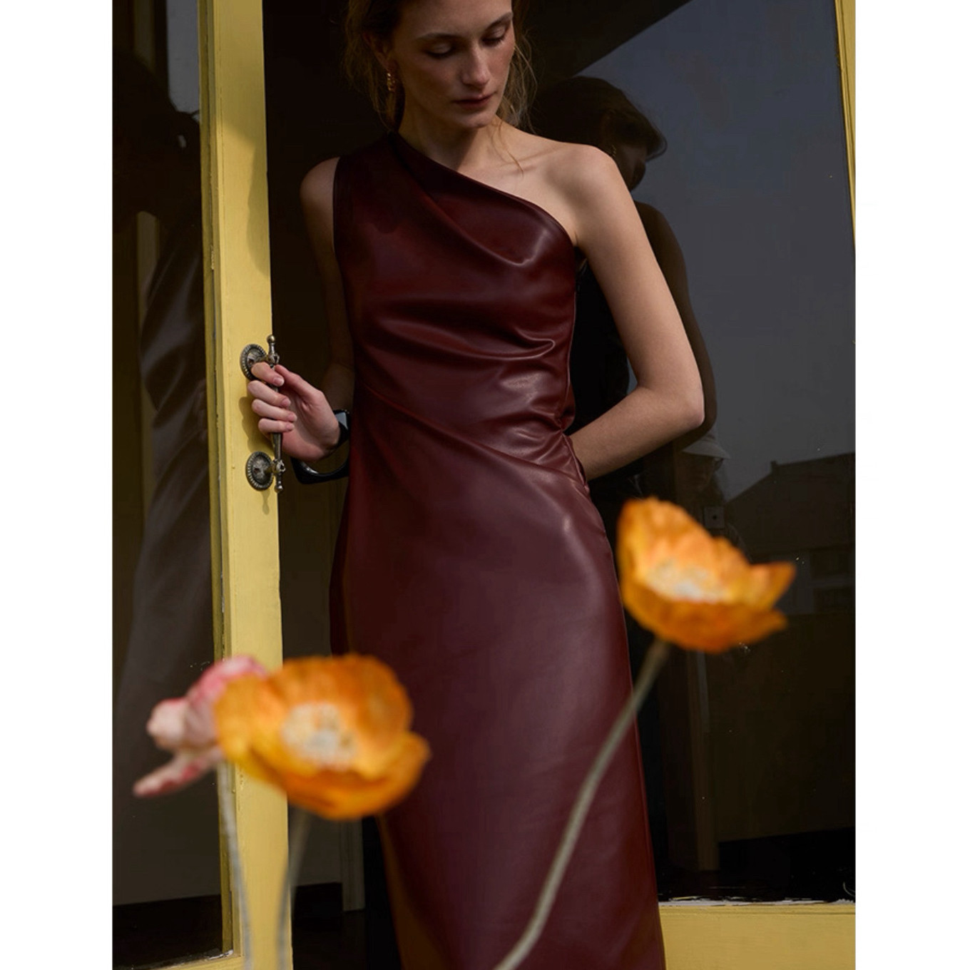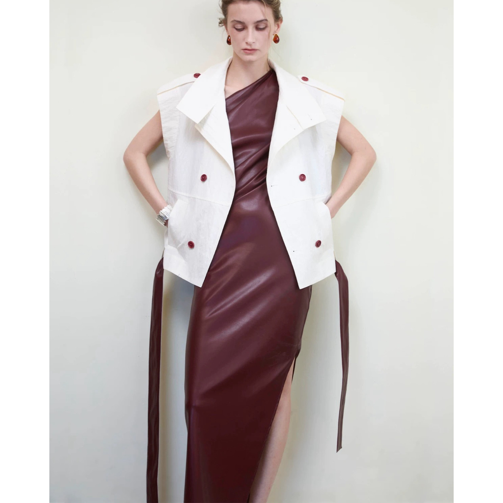 侧开叉收腰长款 斜肩连衣裙女春季 设计师品牌SIP CLASS 皮裙