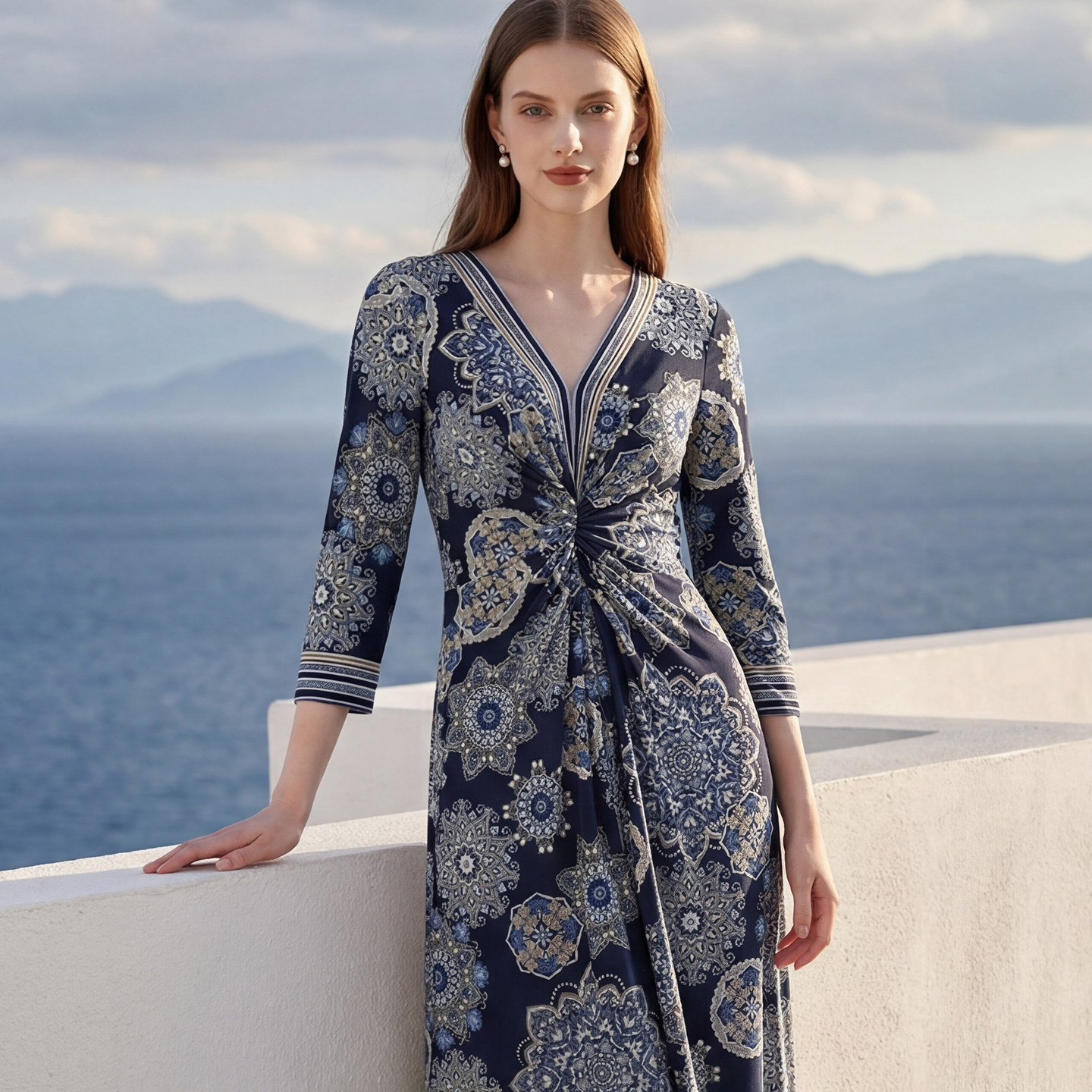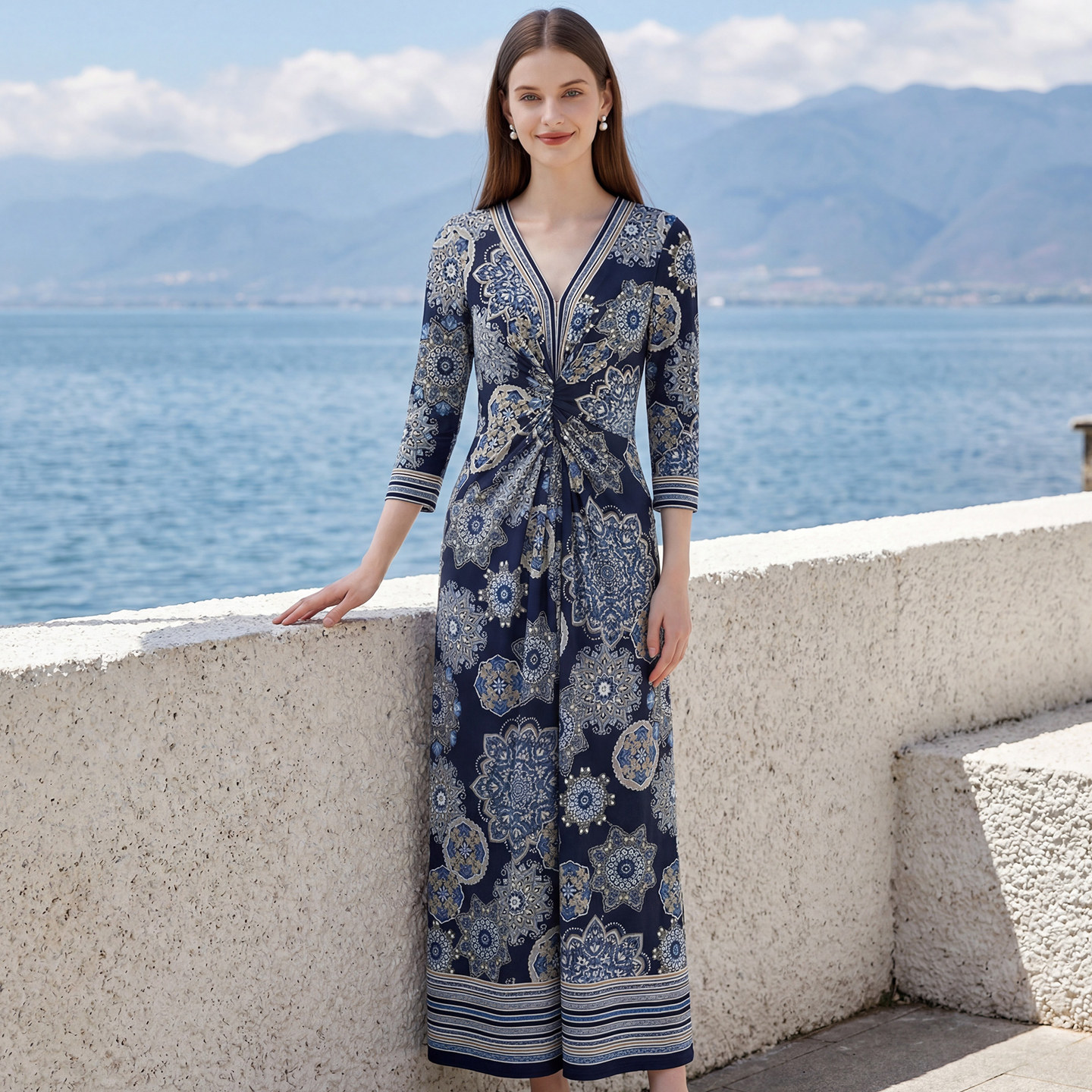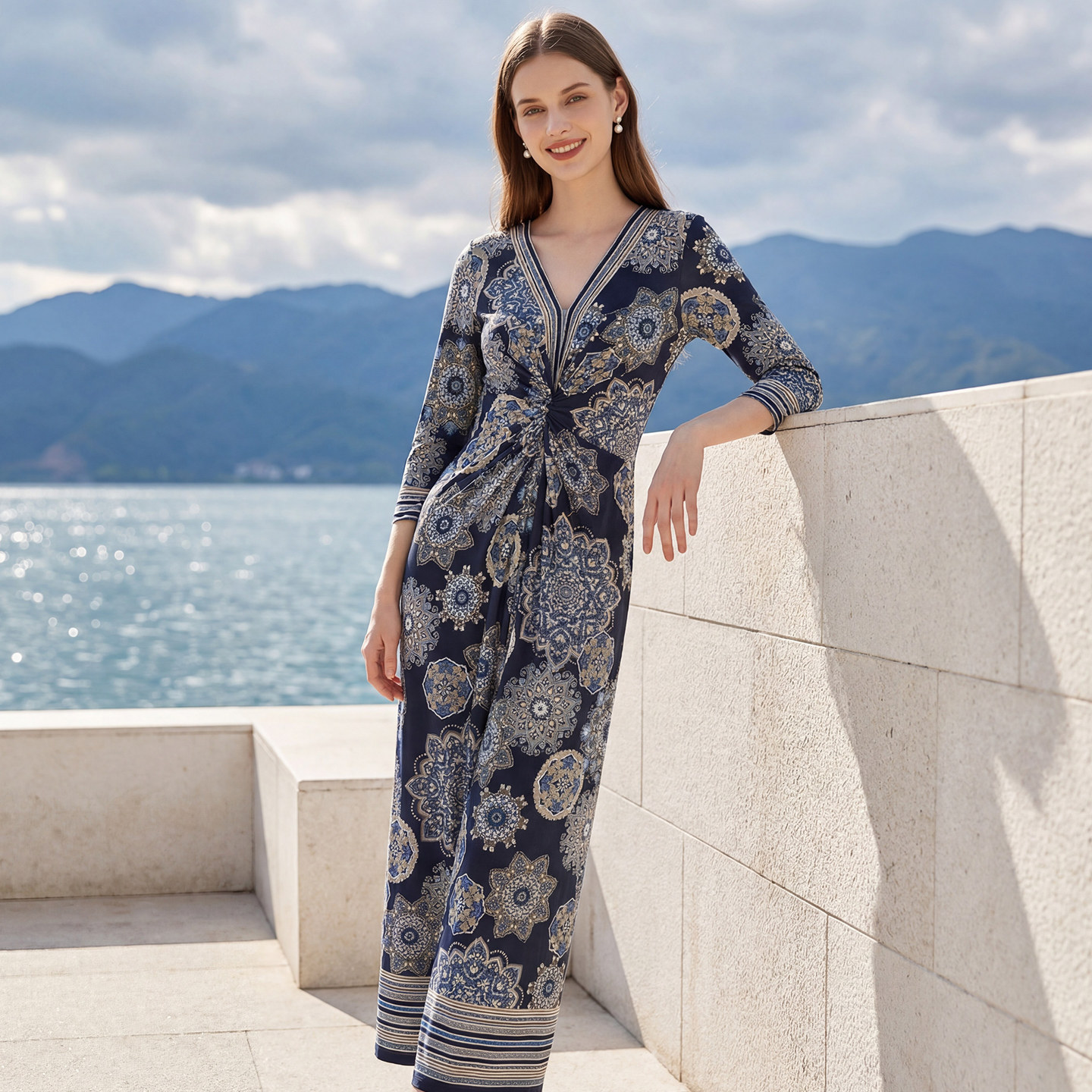 马天奴2026春夏新款 藏青色印花V领收腰连衣裙子长裙气质复古时尚