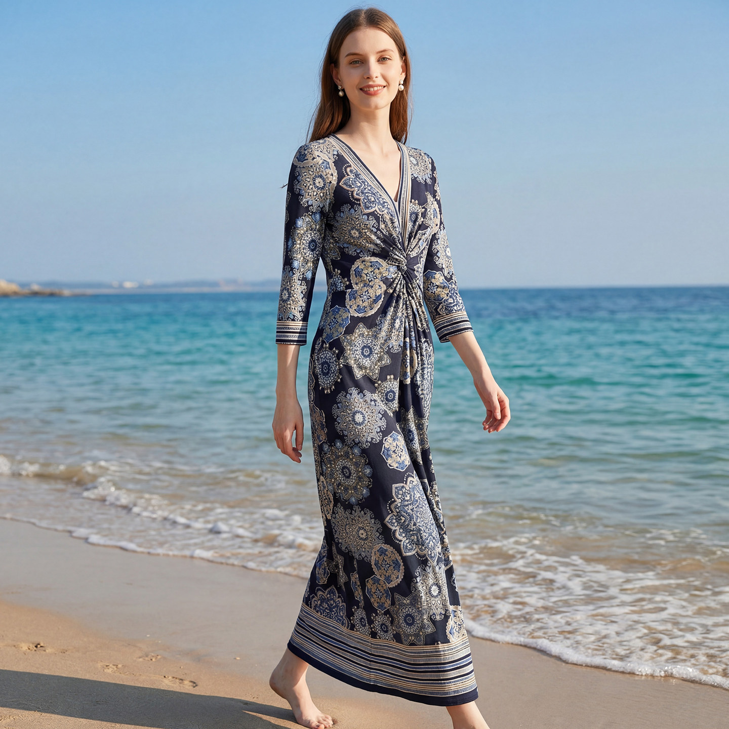 为您提供商品马天奴2026春夏新款 藏青色印花V领收腰连衣裙子长裙气质复古时尚的详细介绍,