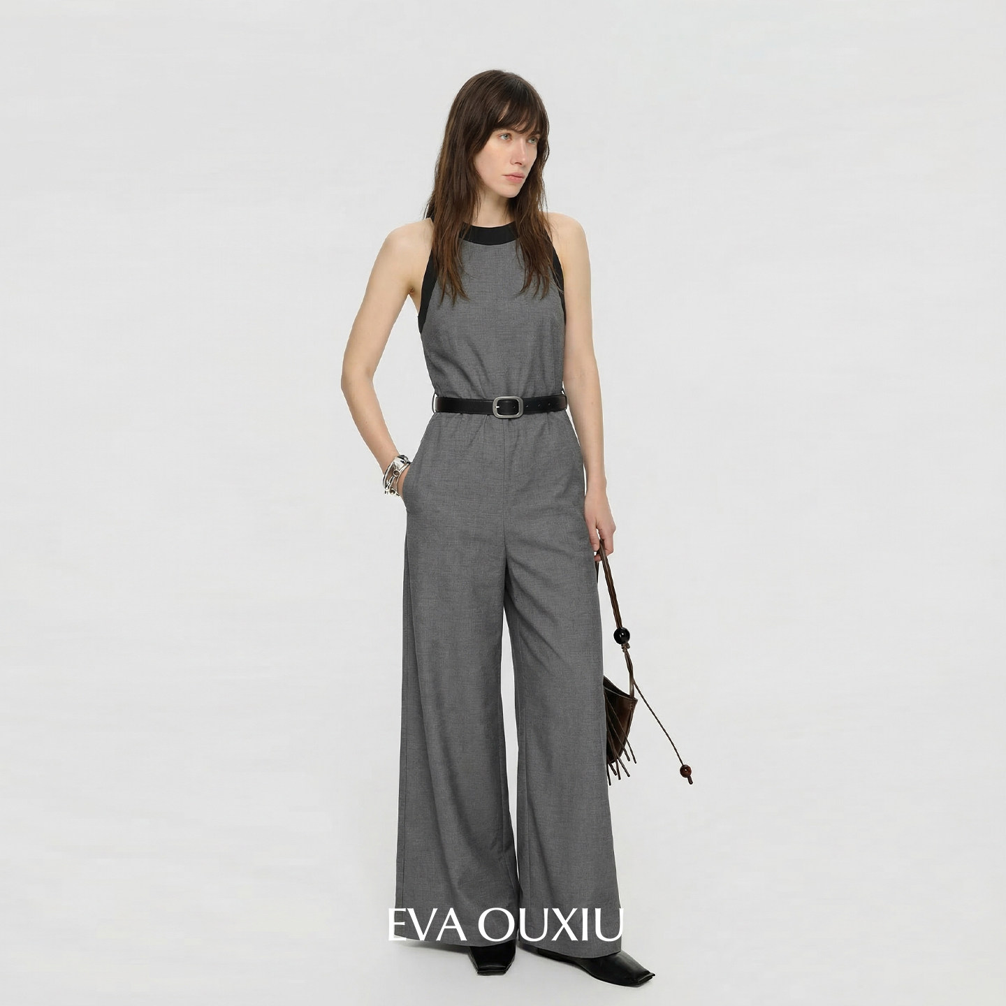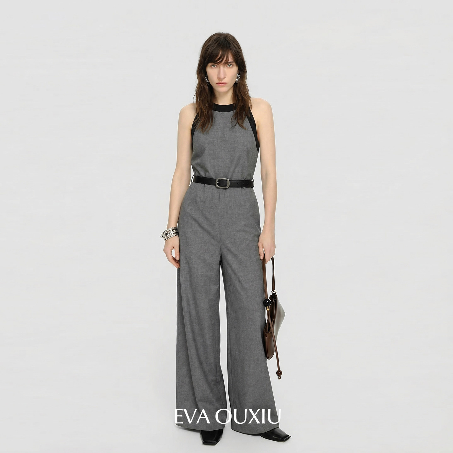 EVAOUXIU商场同款 新款 挂脖撞色收腰阔腿连体裤 女通勤气质 2026夏季