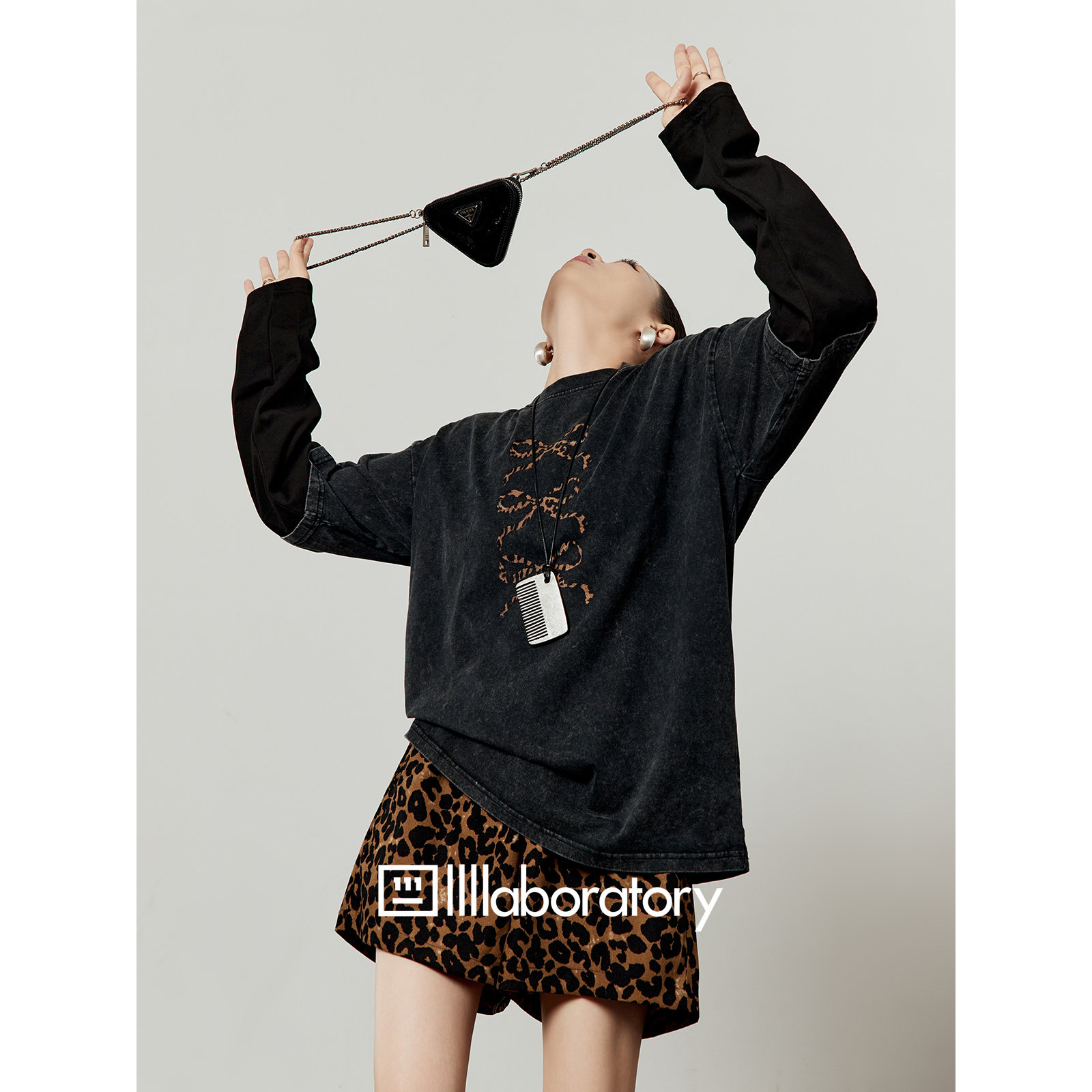 「周里物出品」黑色T恤女2025秋新款 丝绸豹纹蝴蝶结印花宽松长袖由