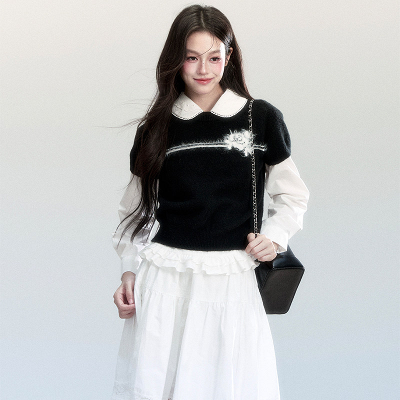 花边针织开衫 外套上衣 甜美拼接娃娃毛衣秋冬新款 蕾丝温柔针织衫
