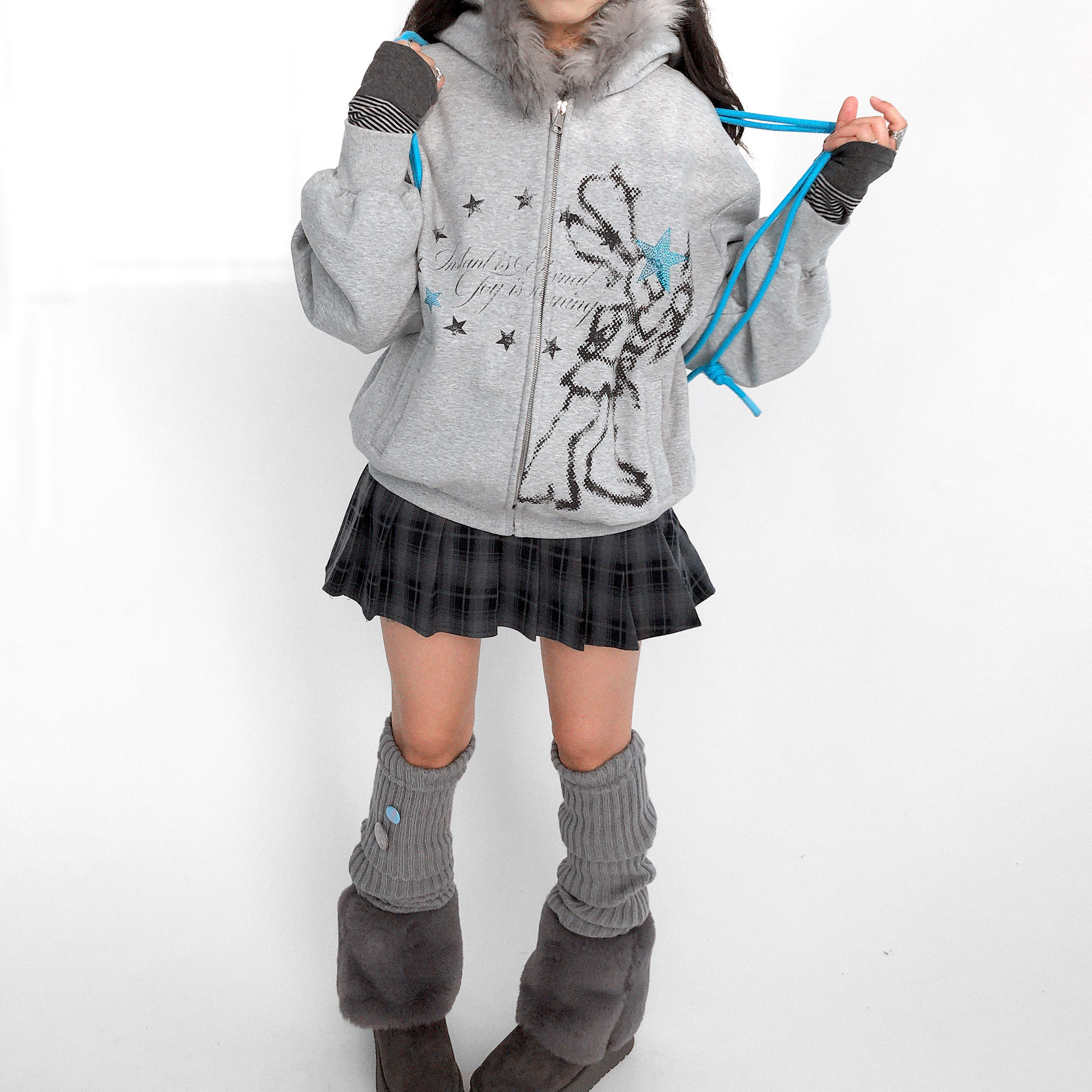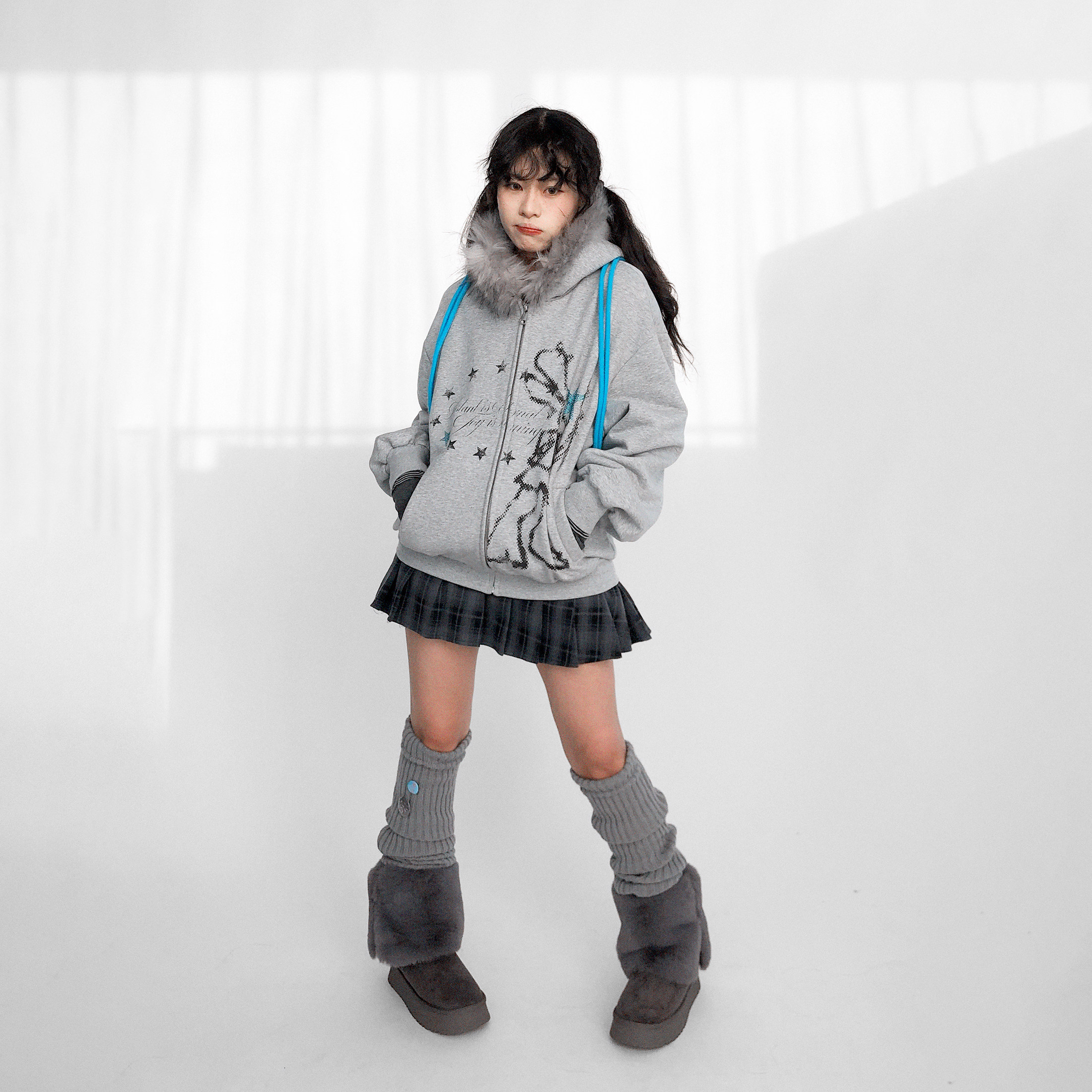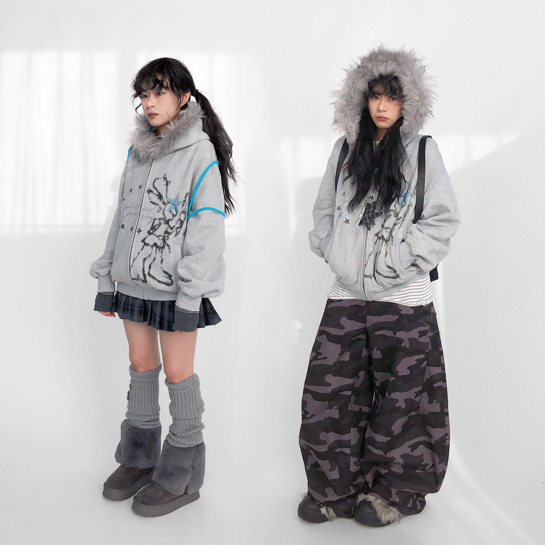 innomoood 毛领厚外套百搭秋冬 像素鼓手兔加绒印花厚连帽卫衣开衫