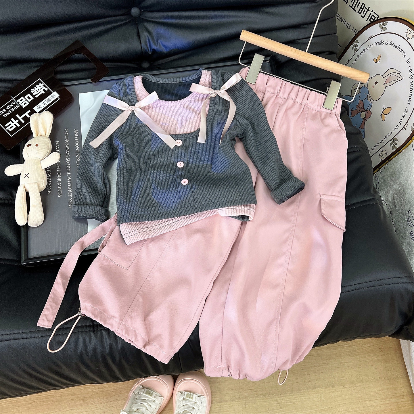 裤 女童洋气套装 两件套 T恤工装 儿童假两件蝴蝶结长袖 2025秋季 新款