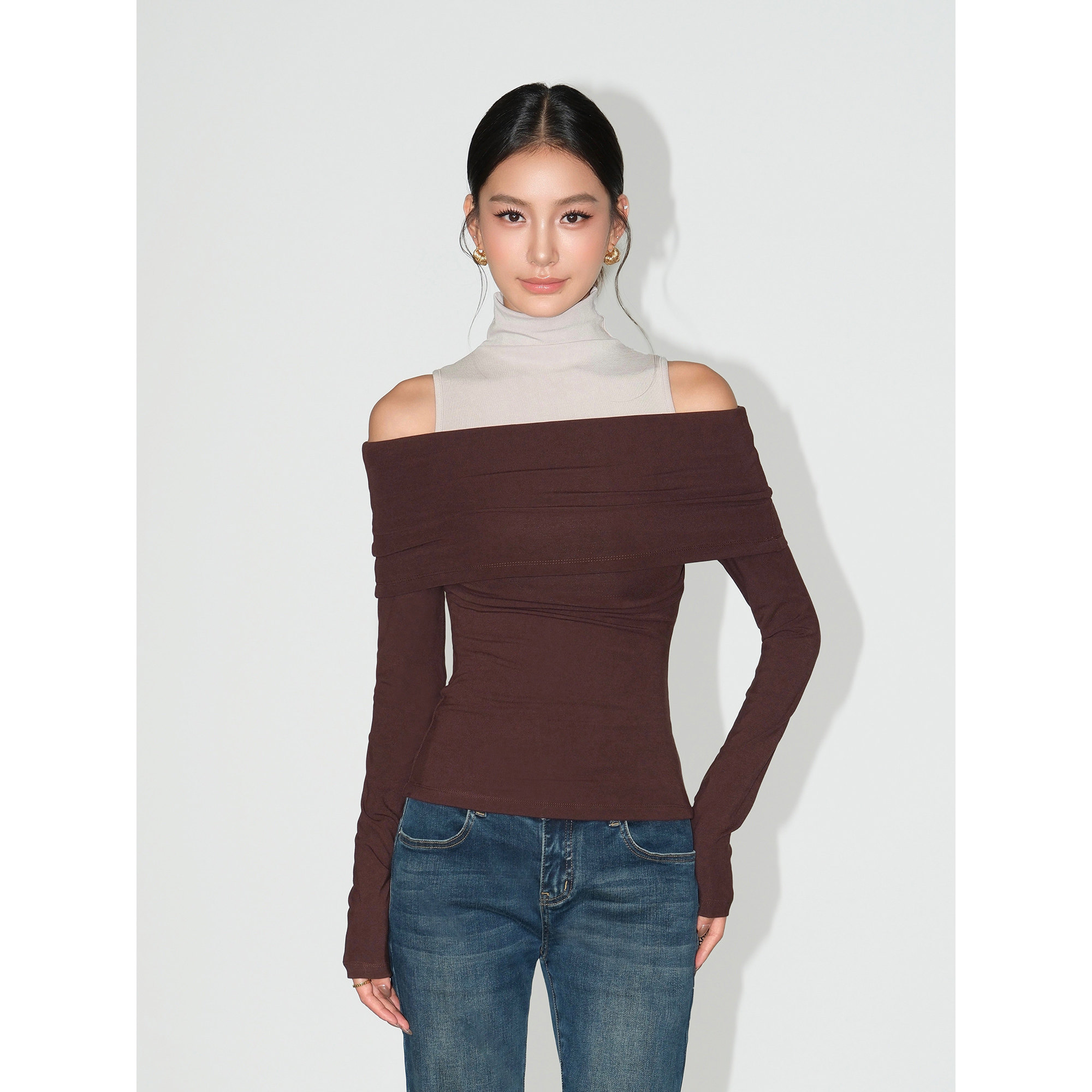 撞色假两件高领打底衫 NEVA 微醺夜晚 露肩针织上衣 女修身