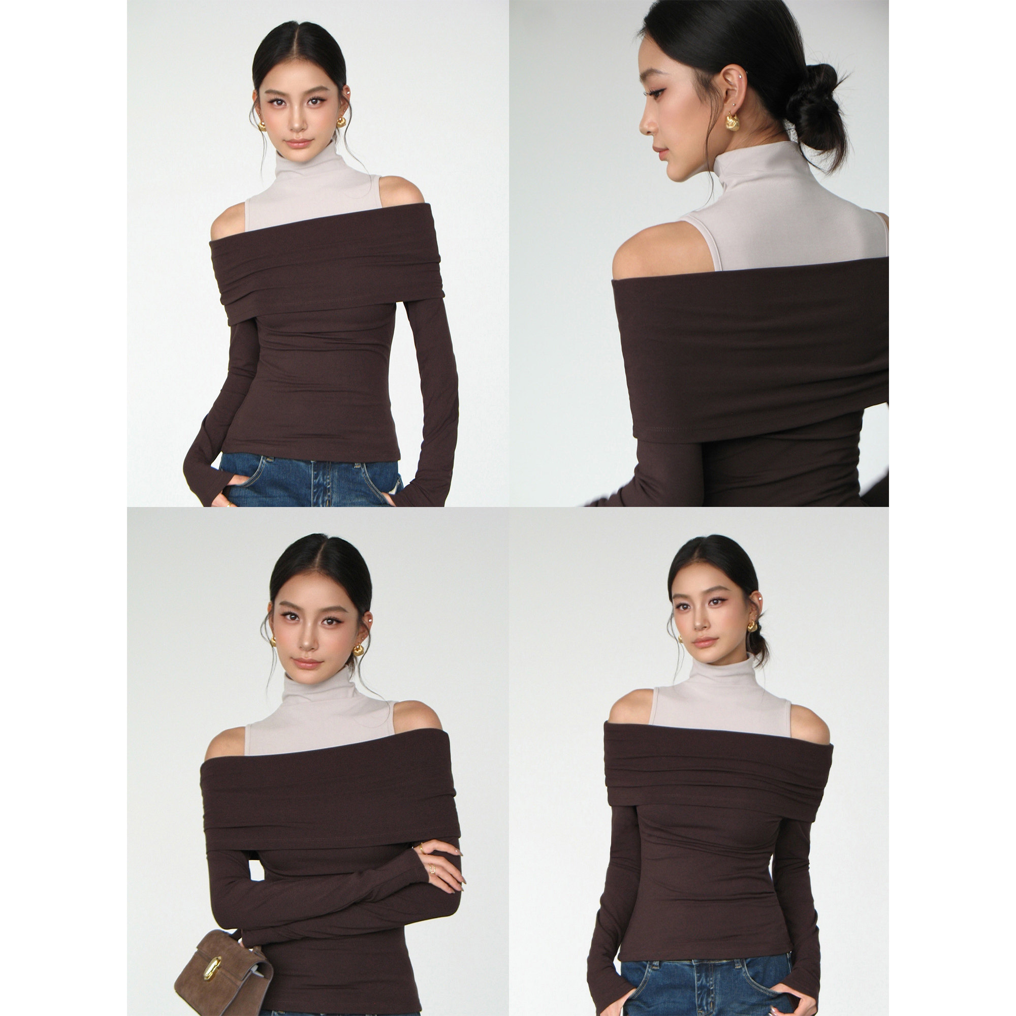 撞色假两件高领打底衫 NEVA 微醺夜晚 露肩针织上衣 女修身由